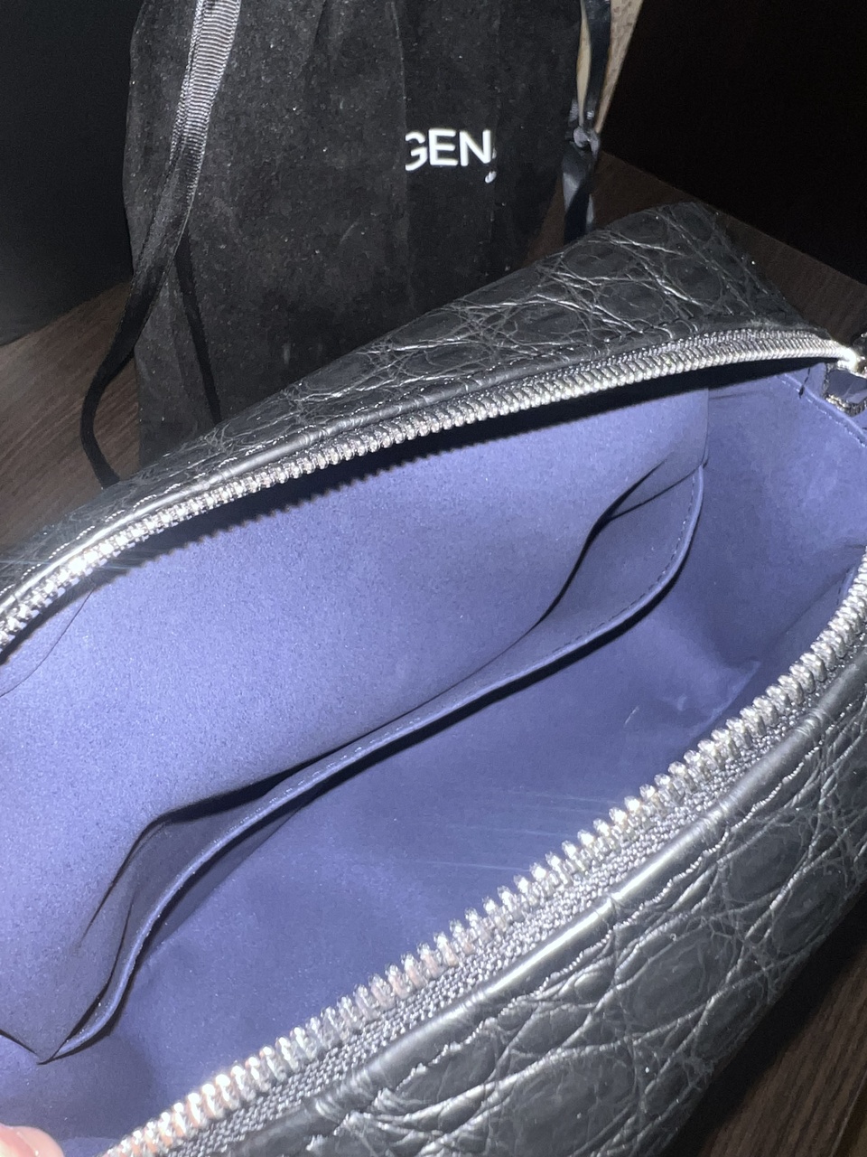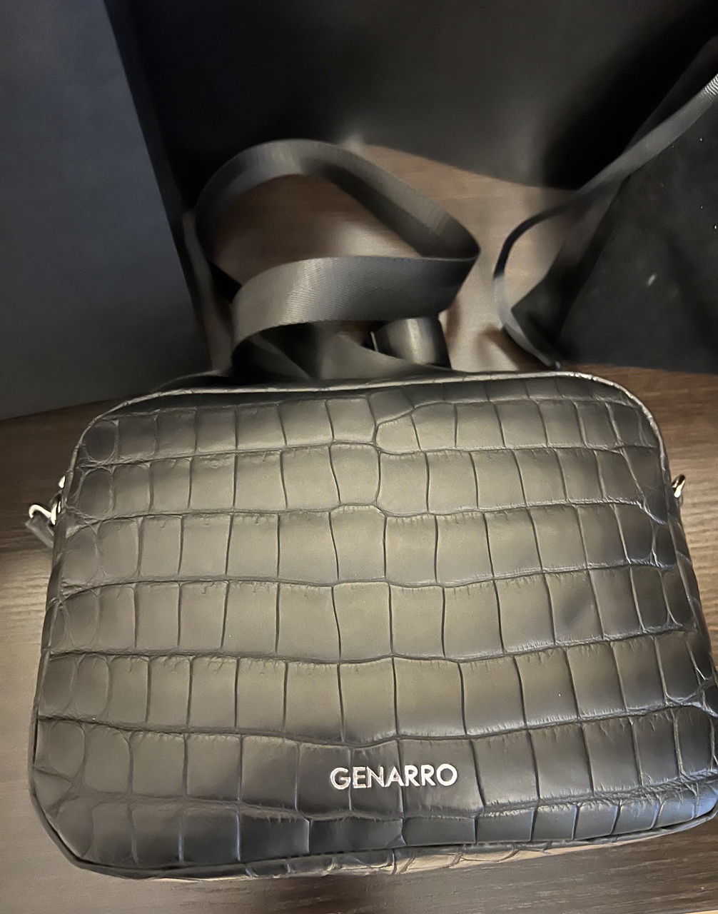 Большая сумка-мессенджер из черного матового крокодила.