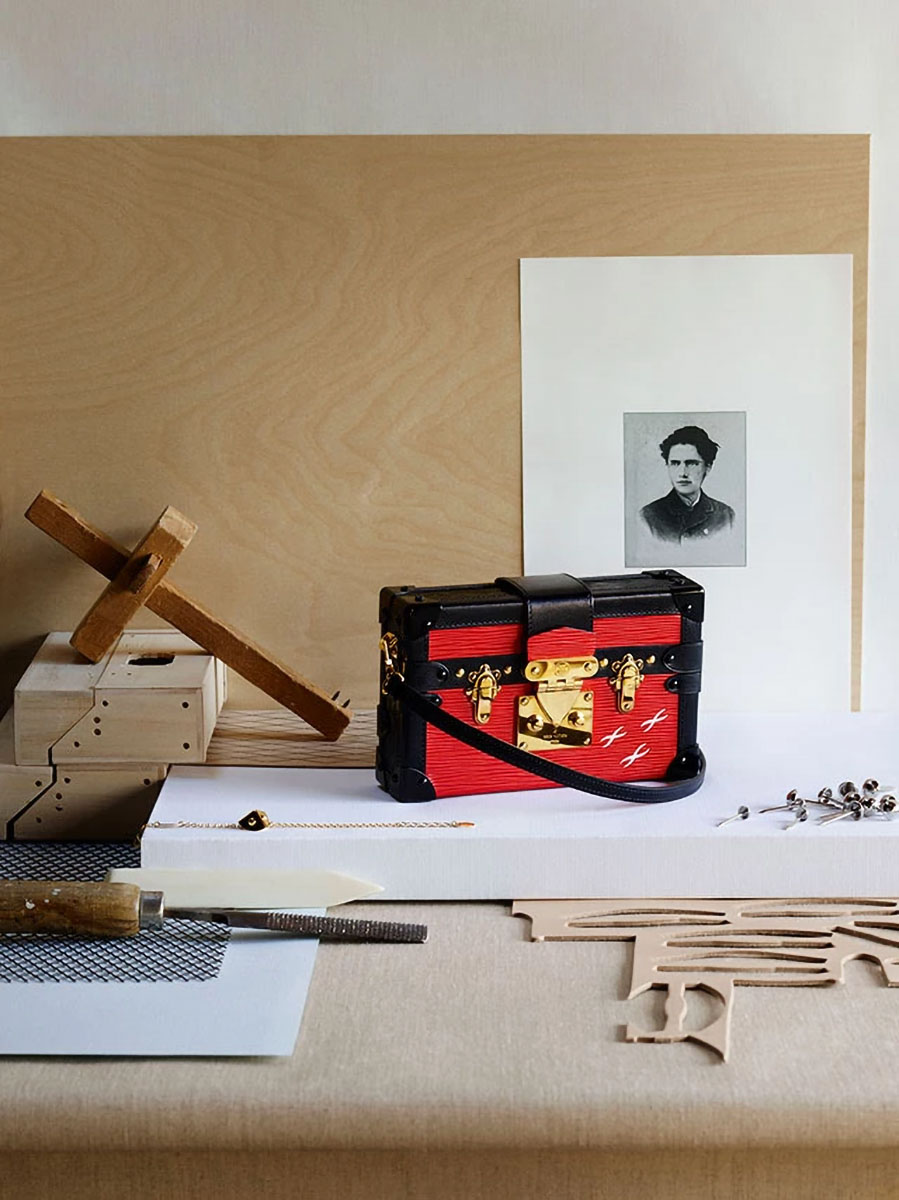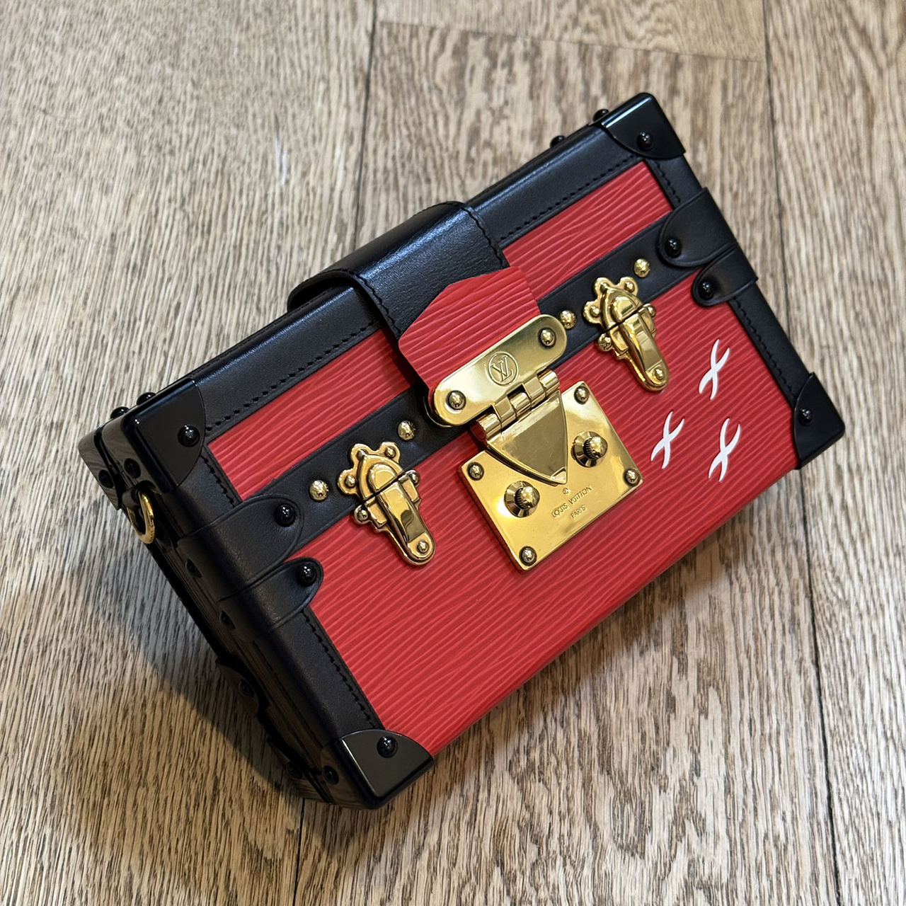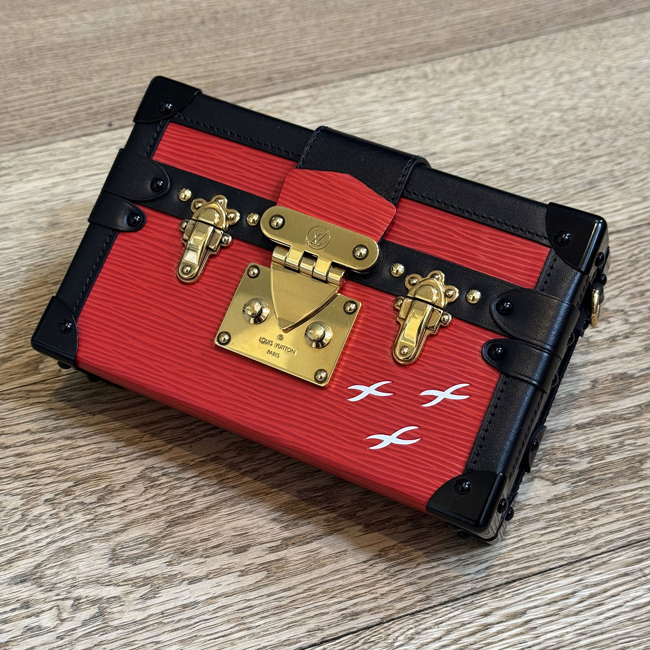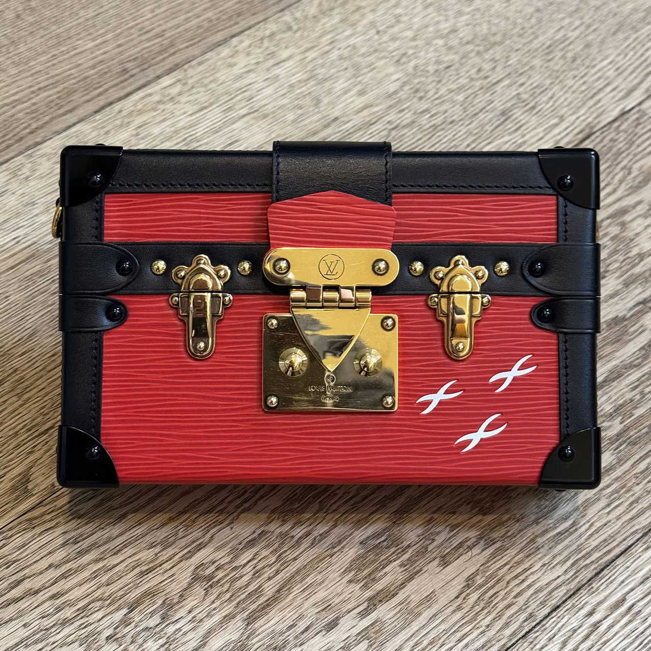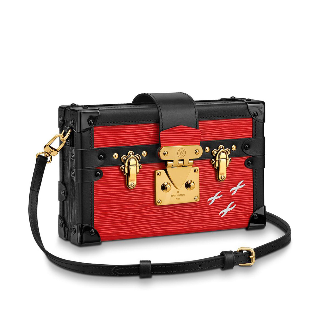Красный цвет сумки в данном случае является отсылкой к историческому "прародителю" дизайна - дорожному сундуку Louis Vuitton, изготовленному в 1929 году для известного банкира и путешественника Альберта Кана. Тот исторический сундук красного цвета с эмблемой Кана в виде трех белых крестиков сейчас находится в музее Louis Vuitton, и именно его дизайн лег в основу образа коллекции маленьких сундучков. Поэтому среди десятков версий Petite Malle красная считается наиболее исторически аутентичной, и именно красный сундучок так популярен среди знаменитостей.