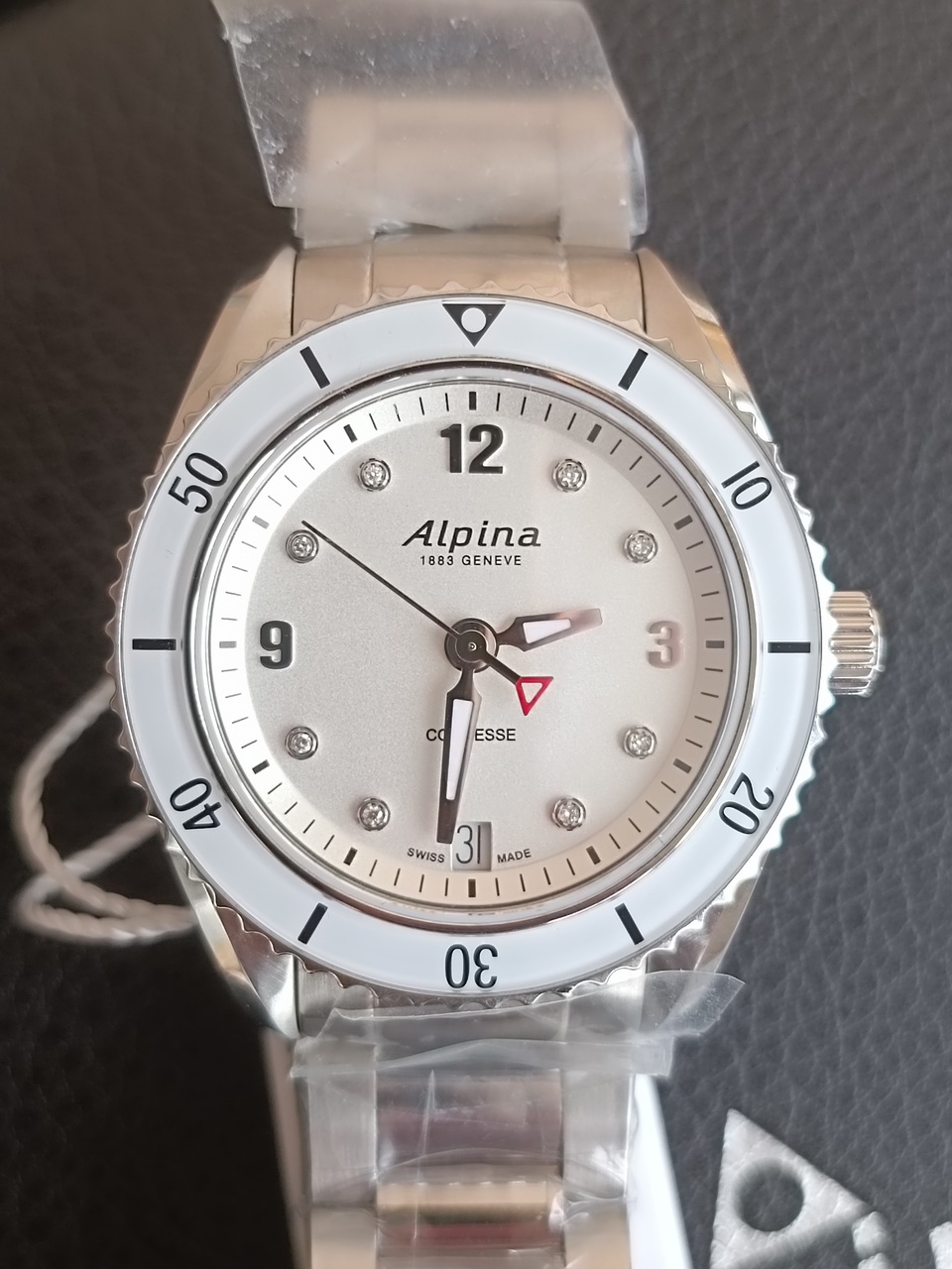 Женские кварцевые часы ALPINA COMTESSE SPORT//8 бриллиантов//36 мм//белый циферблат//браслет//белое на белом//модель в распродаже//