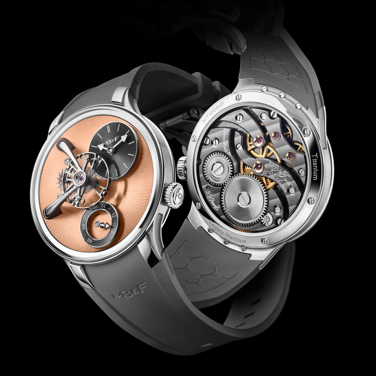 В рамках празднования 20-летнего юбилея MB&F в 2025 году увидели свет две серии LM101 EVO из титана – с оранжево-розовым циферблатом и циферблатом павлиньего зеленого цвета. Эти цвета наносятся на пластину циферблата методом CVD («chemical vapor deposition» – «химическое осаждение из паровой фазы»), который был выбран за его технические преимущества – ведь эта пластина является неотъемлемой частью механизма. Версия павлиньего зеленого цвета особенно привлекательна: в зависимости от освещения ее циферблат переливается оттенками зеленого, синего и фиолетового. Версия оранжево-розового цвета также примечательна – довольно редкий цвет для MB&F.