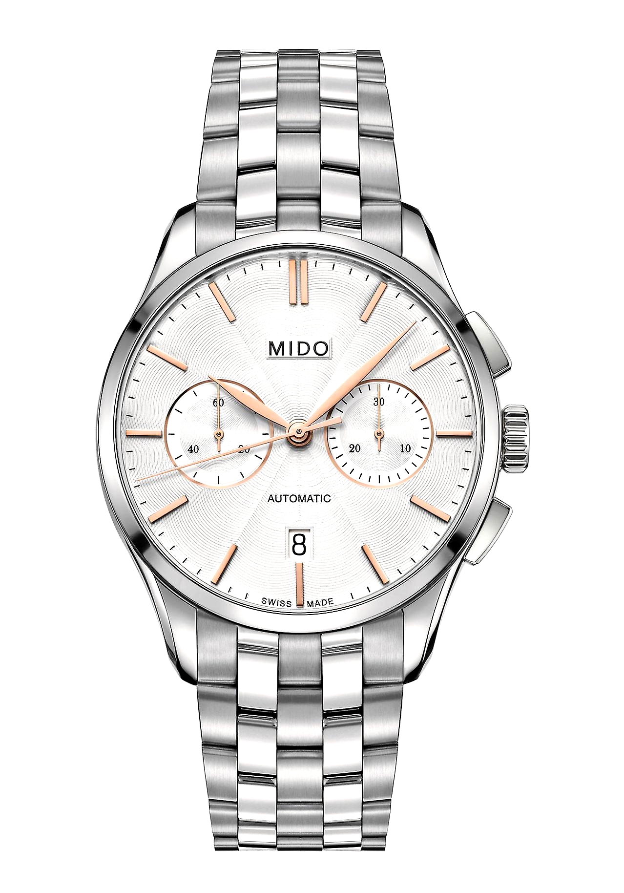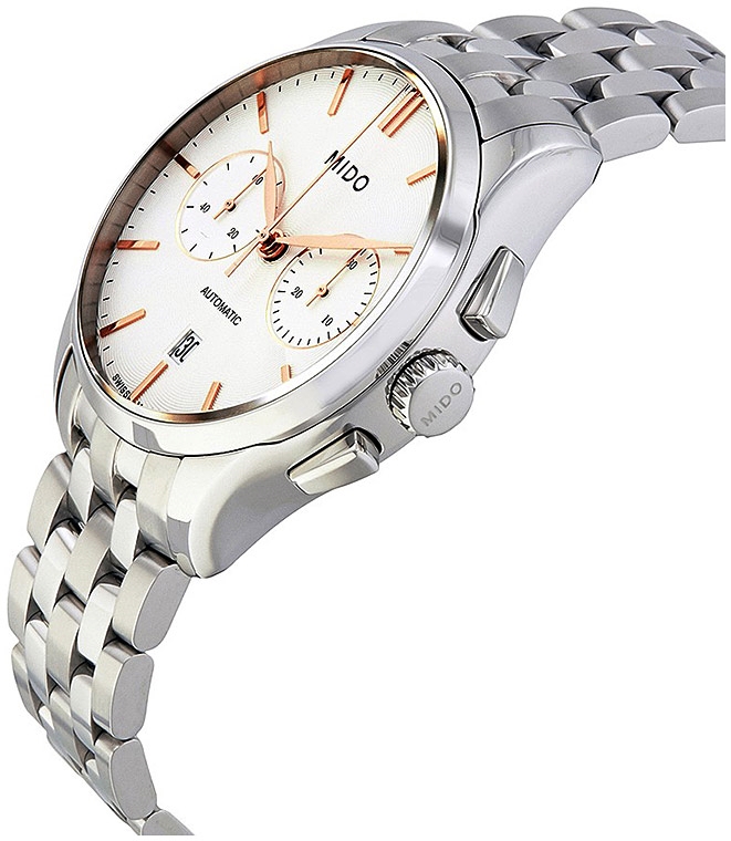 В этом элегантном хронографе соединилось все лучшее, чтобы радовать ценителя классики каждый день. Мужские наручные часы MIDO Belluna II - это часы-хронограф с секундомером в стальном 42мм корпусе. В швейцарском автоматическом механизме 27 камней, частота 28800 полуколебаний в час, запас хода до 60 часов. Гильошированный светло-серебристый циферблат с накладными золотистыми метками в виде штрихов. Окошко даты. Рифленая заводная головка. Прозрачная задняя крышка. Стальной браслет с раскладывающейся застежкой.