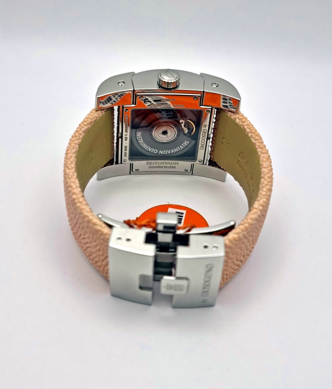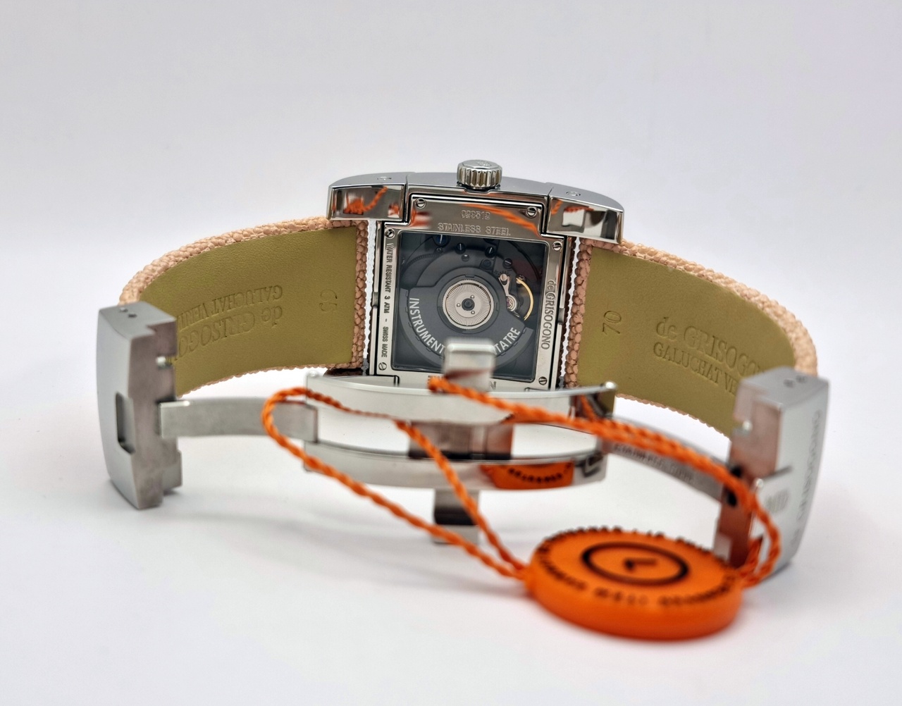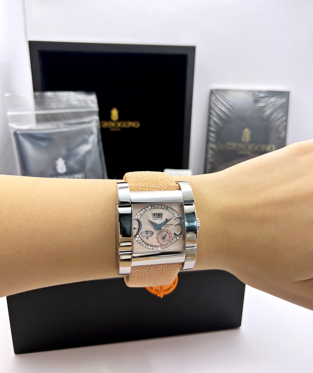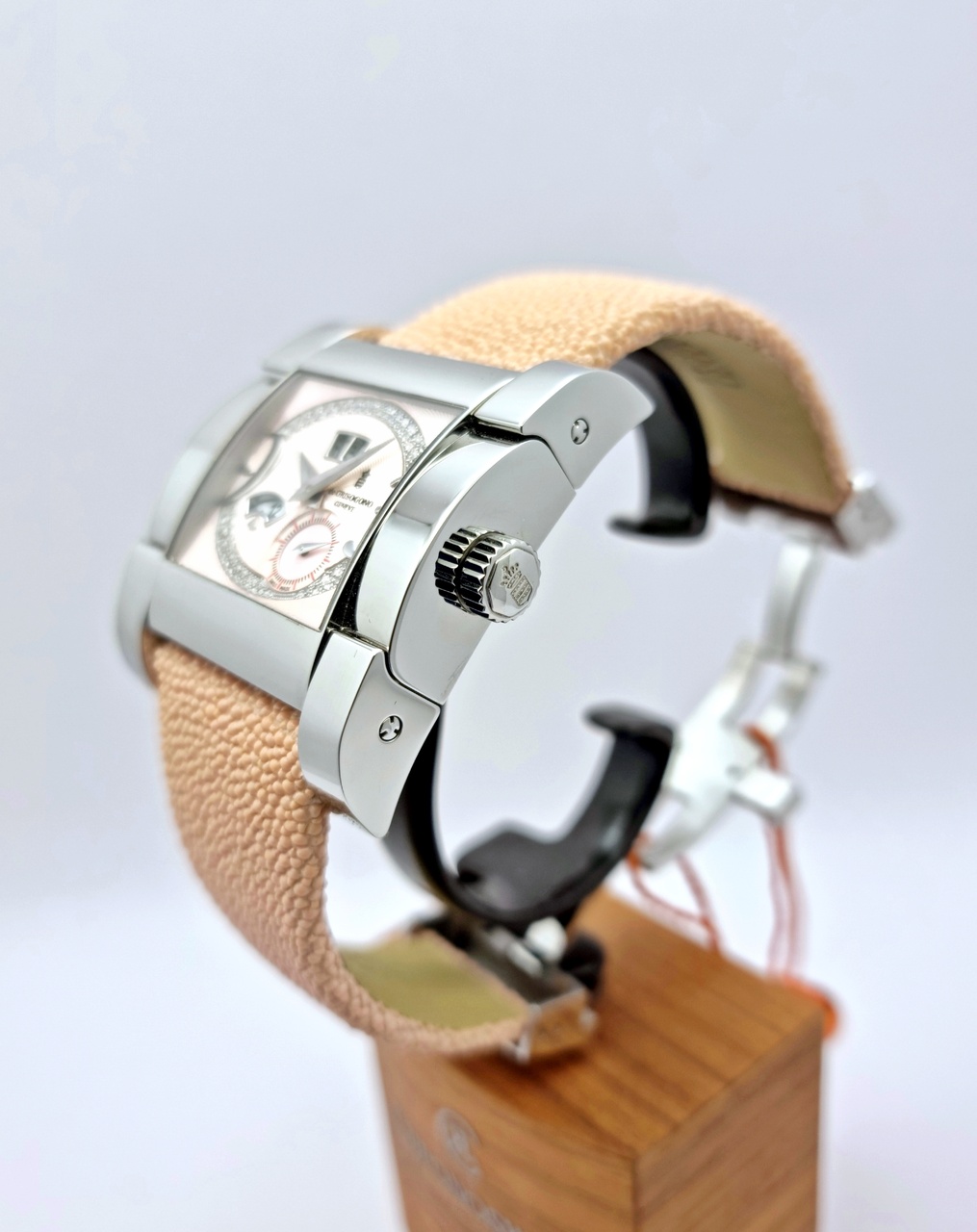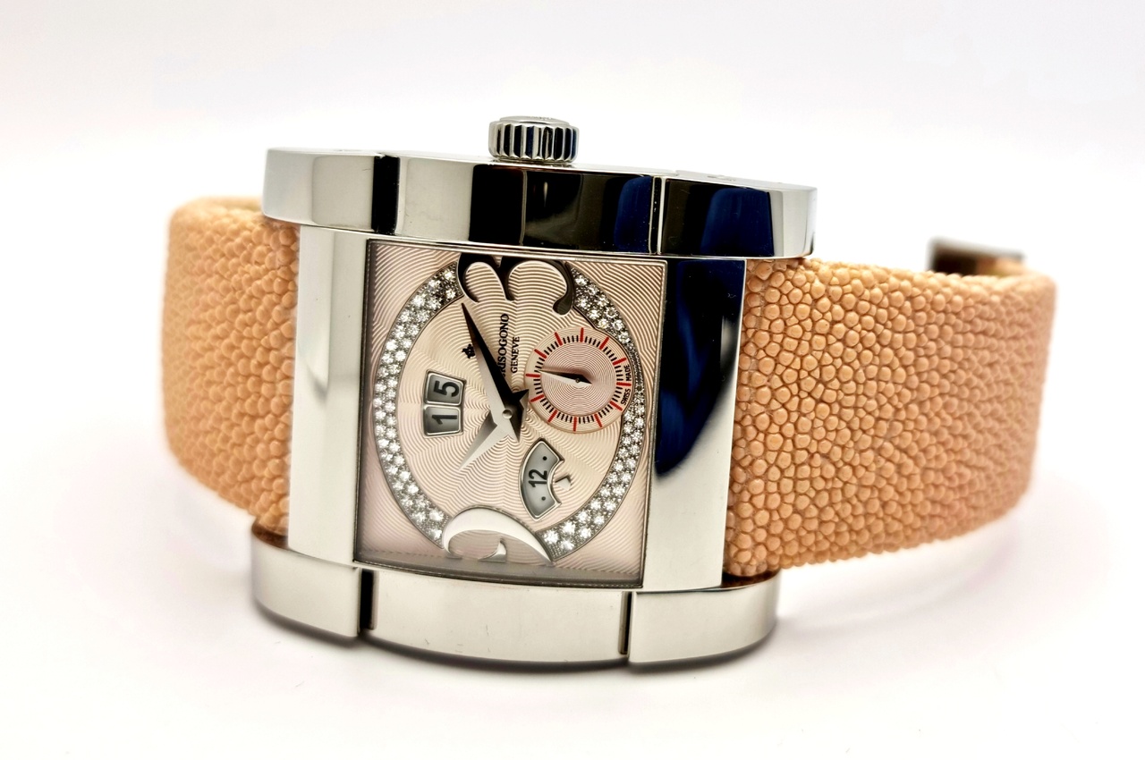 Уникальные и потрясающие швейцарские часы от De Grisogono из коллекции Instrumento Novantatre станут настоящим подарком для истинных поклонников классики и традиций, которые прошли сквозь десятилетия. Эти шикарные часы гармонично дополнят образ своего обладателя и подчеркнут его индивидуальность и изысканный вкус. Часы выполнены в корпусе из нержавеющей стали размером 40х47 мм. Светло - розовый цвет циферблата с узорами соответствует самым последним крикам моды, а россыпь бриллиантов подчеркнёт статус своего обладателя. Не оставят без внимания эти часы своего владельца также и от взглядов часовых гуру, так как данный механизм имеет годовой календарь и большую дату, что является часовым усложнением и предоставляет возможность своему владельцу всегда знать не только время, но и дату с месяцем. Модель поставляется на кожаном ремешке в тон циферблату с раскладывающейся стальной застежкой.