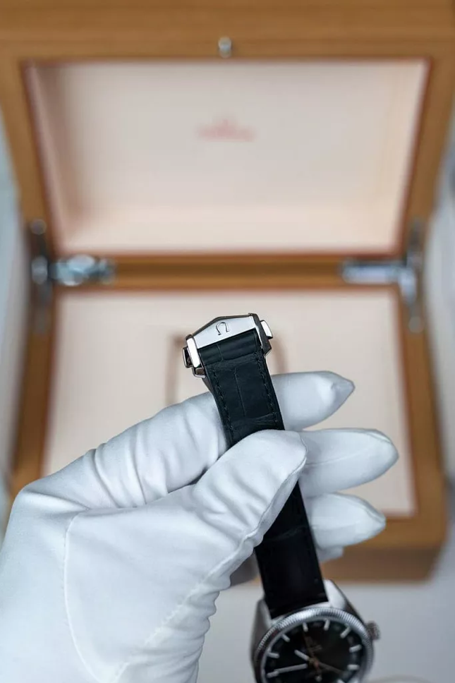 Материал ремешка/браслета: темно-зеленый из кожи аллигатора, ширина 20 мм. Браслетная застежка с гравированной эмблемой Omega