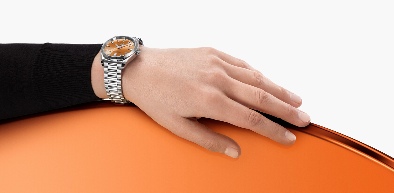 Браслетная застежка “бабочка”, раскладывающаяся при нажатии на кнопки двойной системы блокировки, с гравированной эмблемой Omega