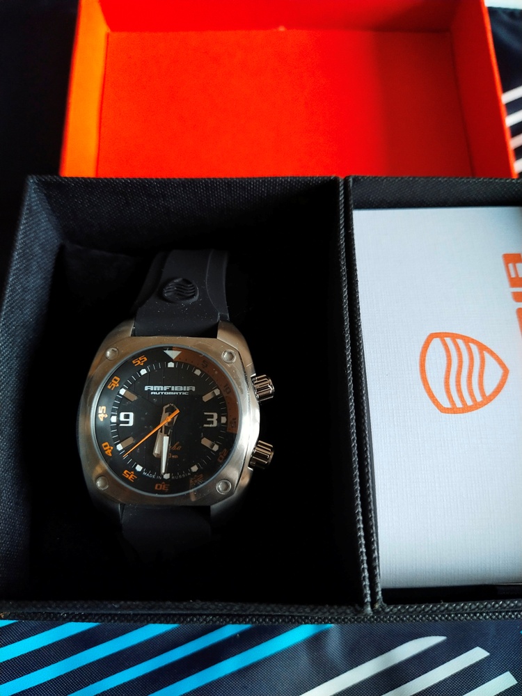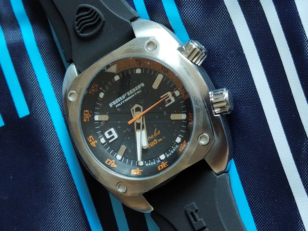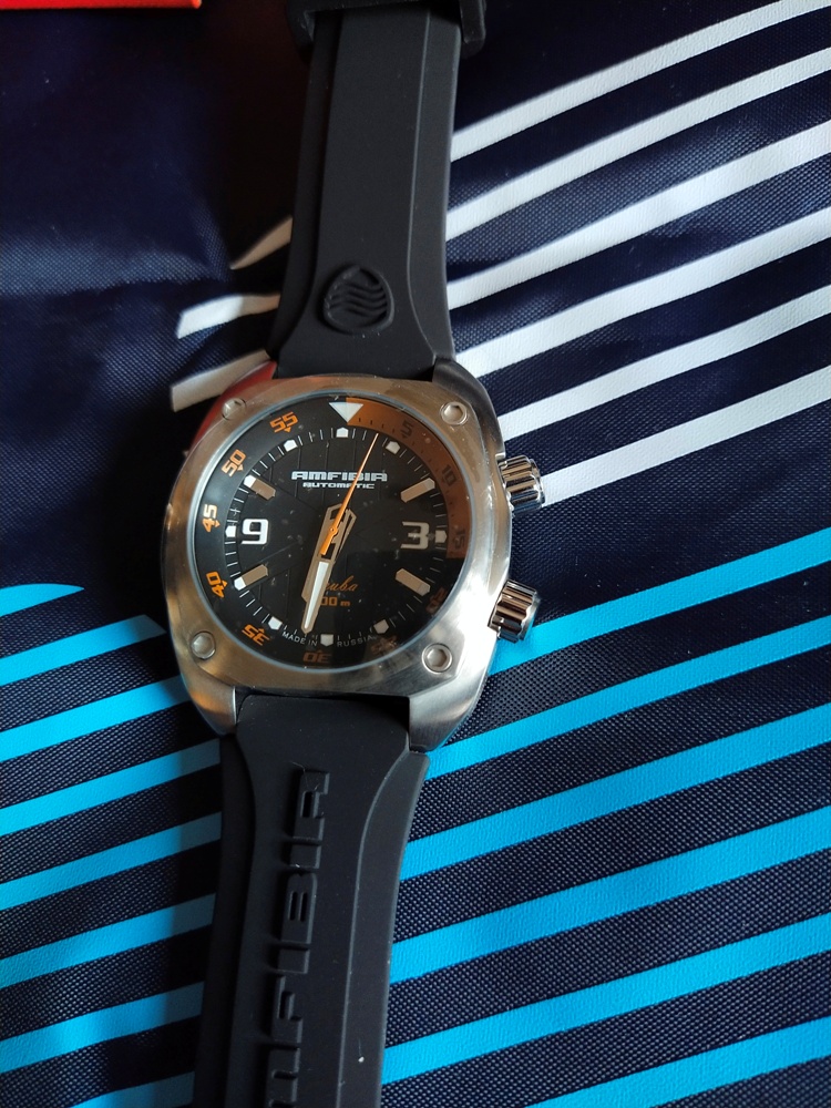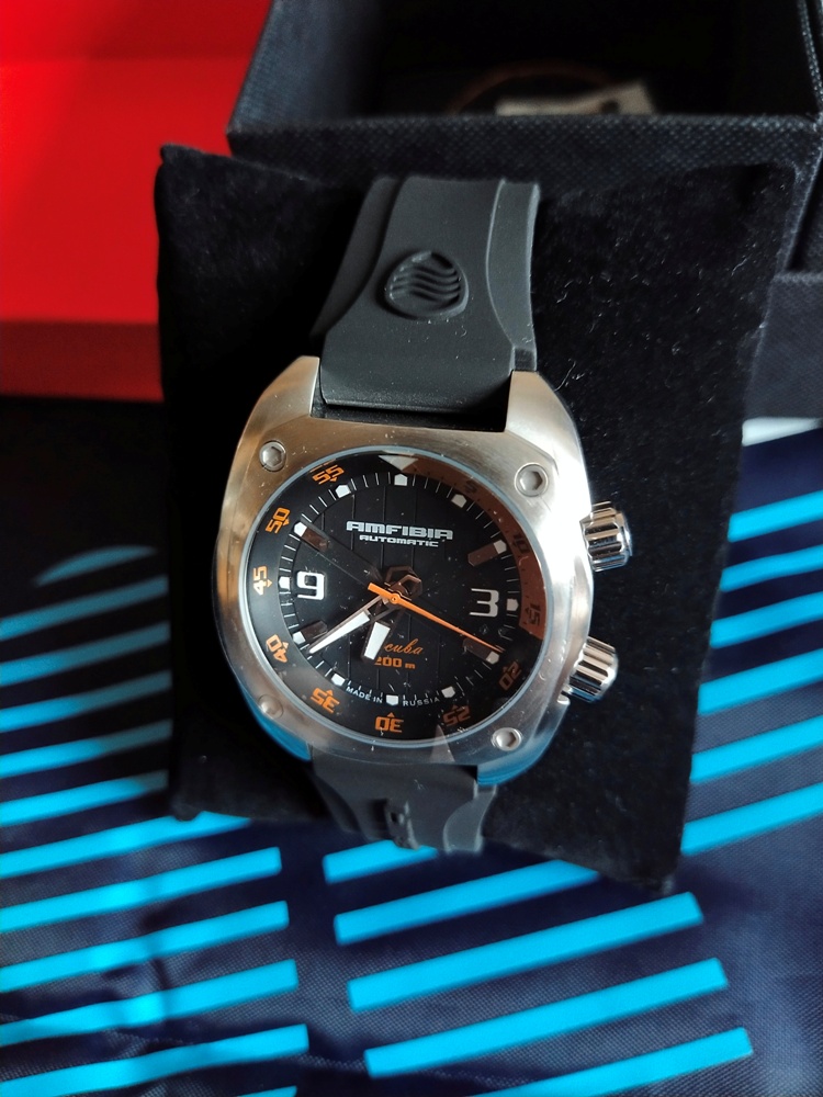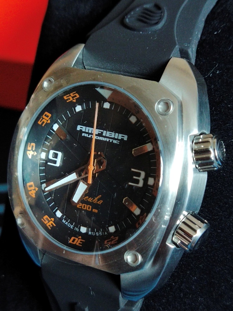 Часики совершенно новые, не носились. На стекле плёнка (точки на стекле, что на фото – от нее). Задняя крышка и обе головки – винтовые. Ремень каучуковый. В комплекте сами часы, фирменный короб, инструкция/гарантийка, - все, что было при магазинной продаже. А, да, с производства они сняты))