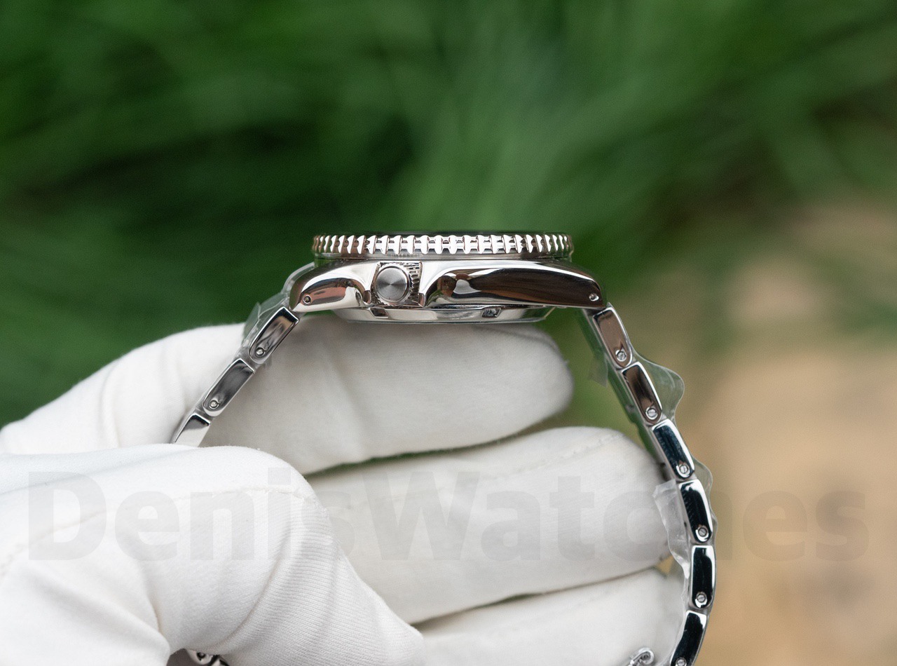 Стальной корпус, сатин + полировка, защитные наплывы у заводной головки
