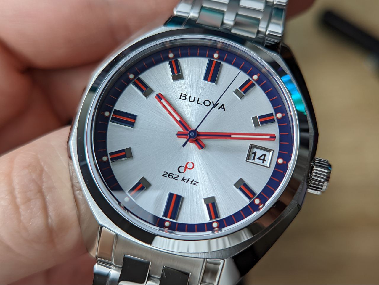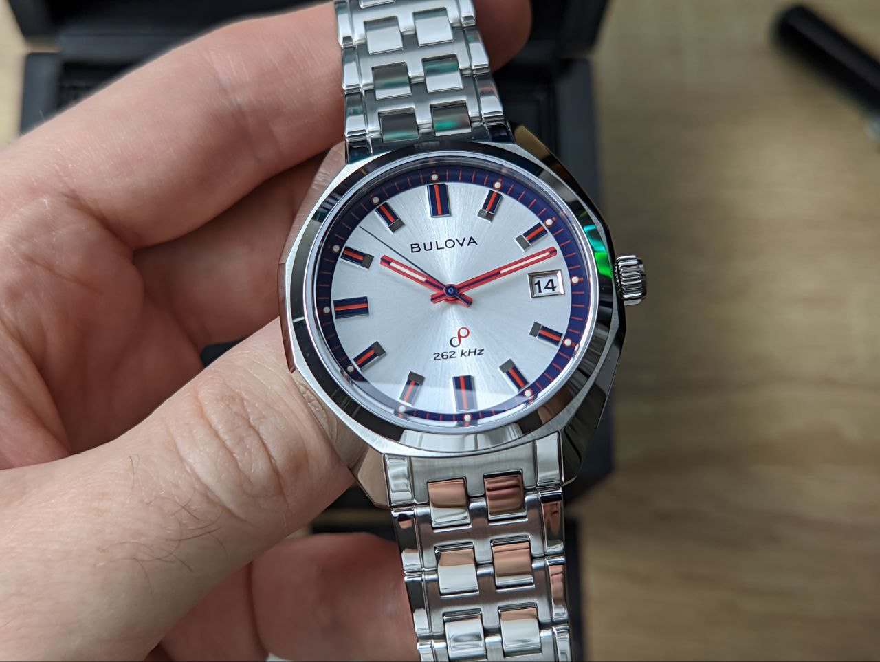 Переиздание исторической модели Bulova 1973 Jet Star “F” на современном высокоточном кварцевом механизме HPQ Bulova’s Precisionist с частотой 262kHz и очень плавной секундной стрелкой.