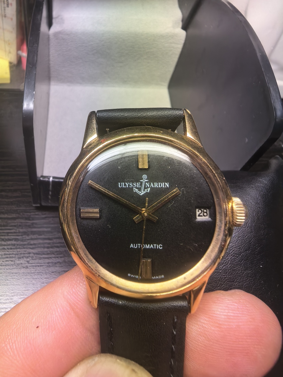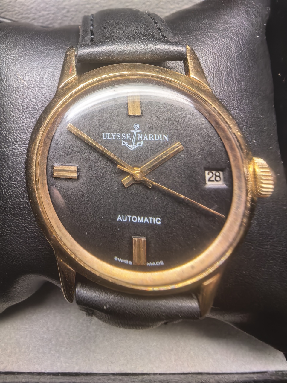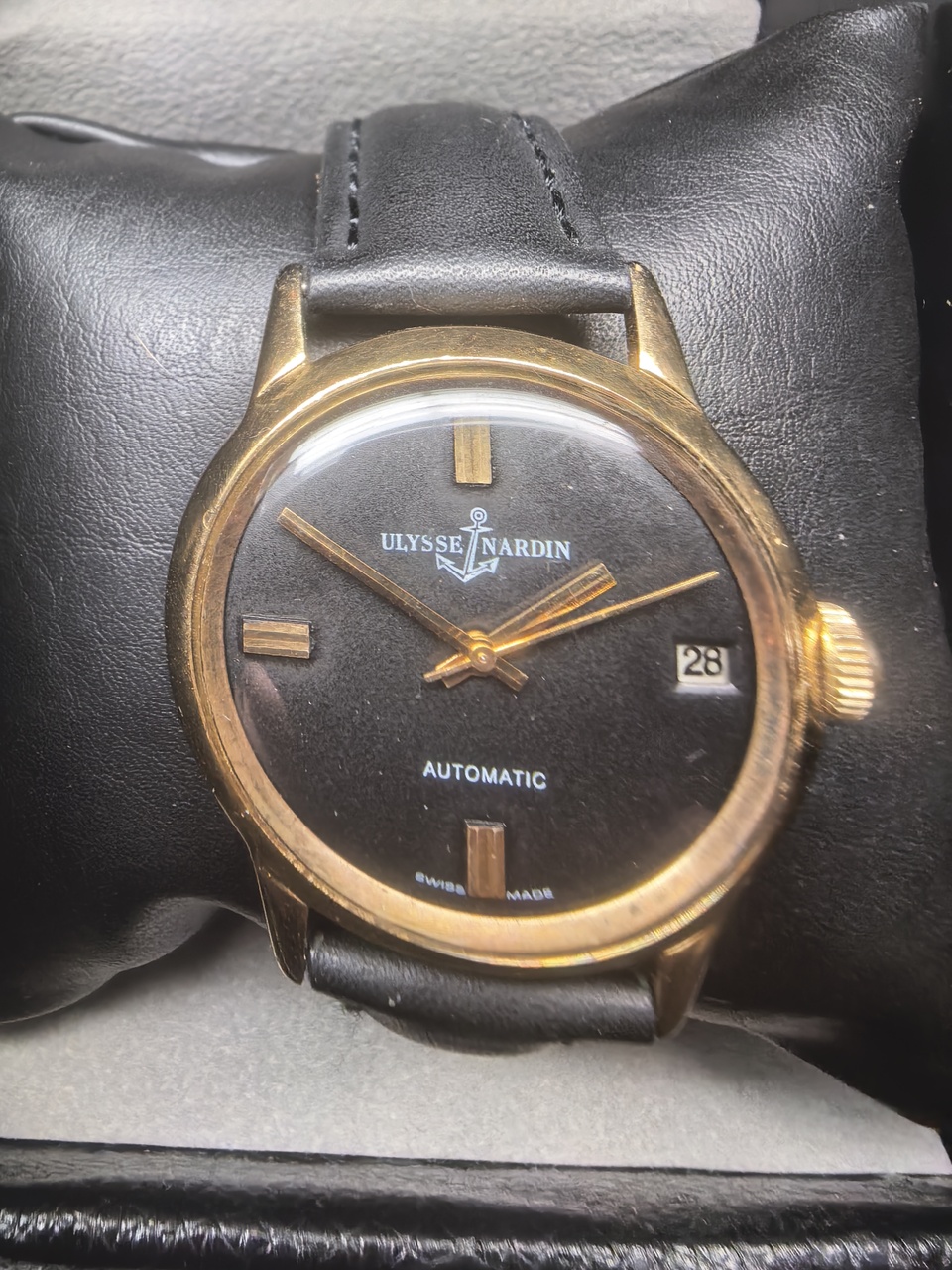 Потрясающие и редкие часы Ulysse Nardin. 36мм диаметр. 1962 года (примерно). Рабочие. Автомат. Черный циферблат с золотыми стрелками. На 3 часа в окошке дата. Тонкий корпус с золотым покрытием. Задняя крышка из нержавеющей стали. Кожаный ремешок состояние нового. Украсят любую коллекцию. Москва. Встреча или отправка курьерскими компаниями.