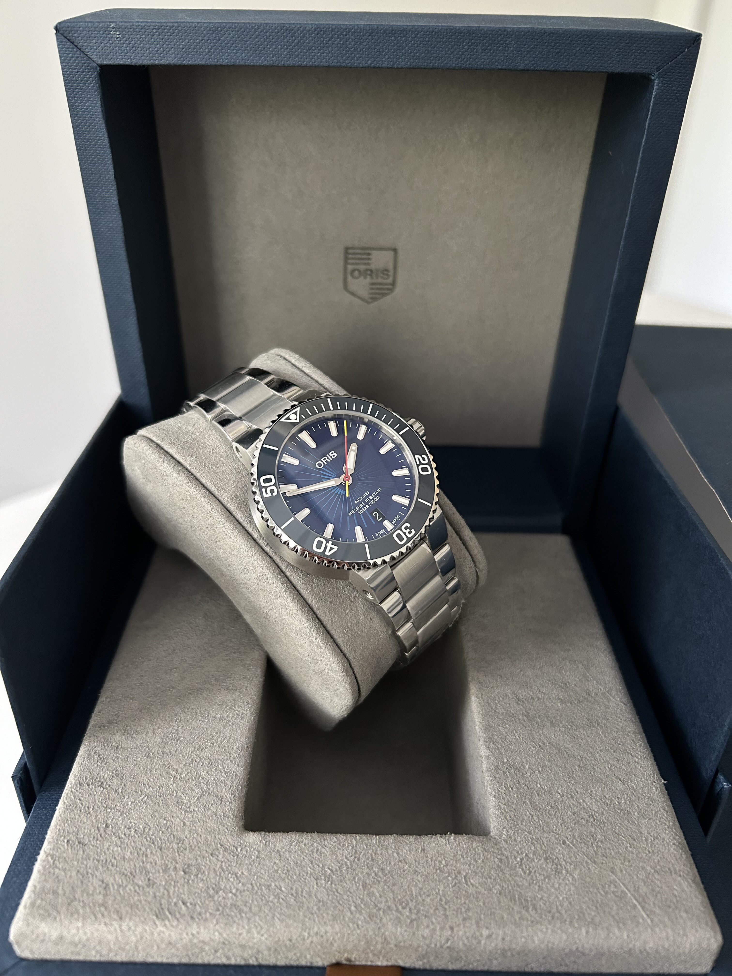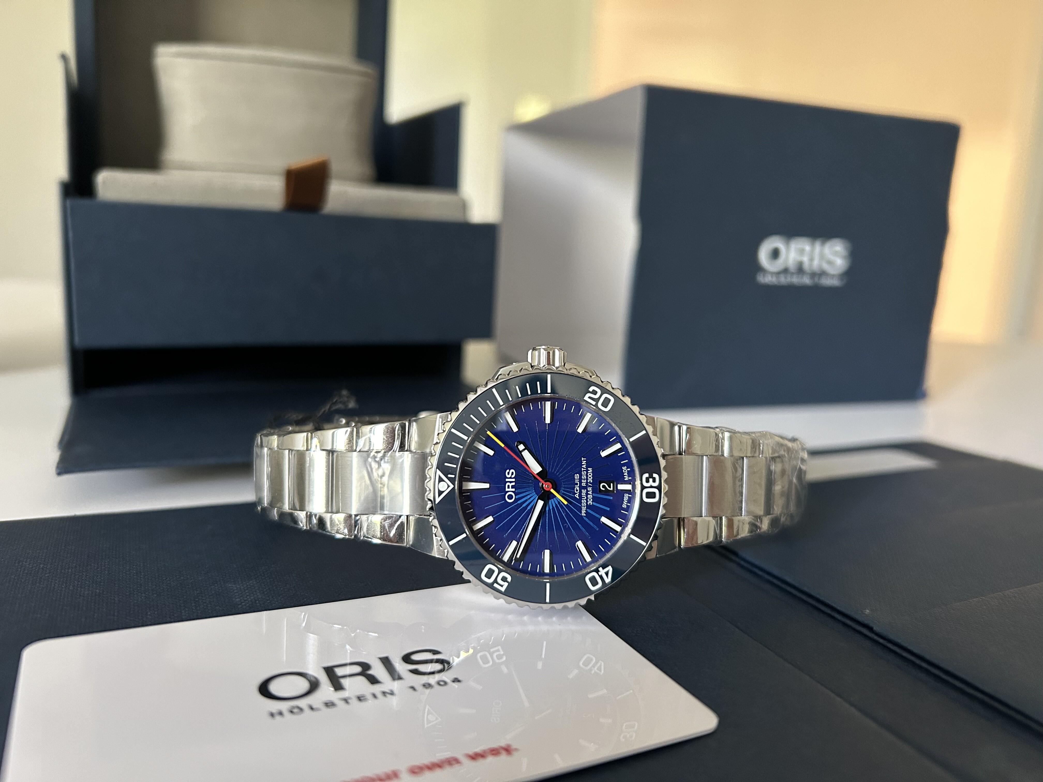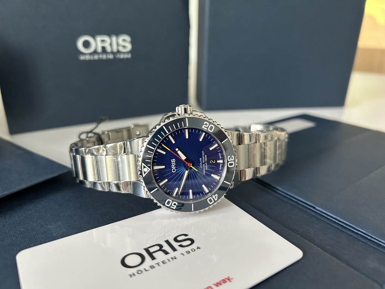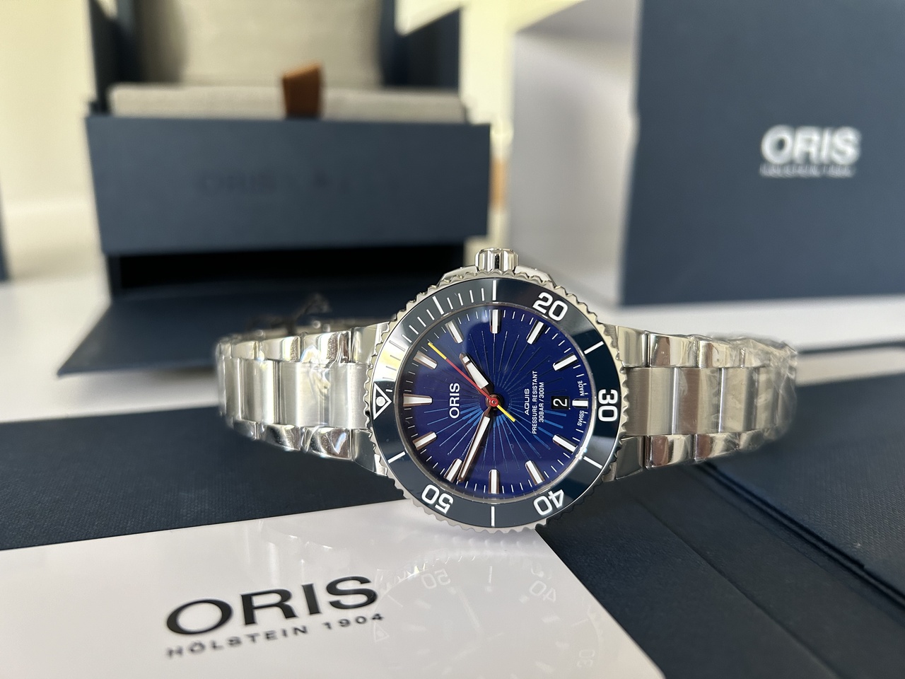 За что мы любим Oris Aquis: за размерный ряд, за классные цвета, отличную отделку, керамические безели, антиблик (который придаёт совсем другой вид часам), за отсутствие ушек у часов, отличную артикуляцию качественного браслета, сильно сужающегося к застёжке и возможность без проблем купить оригинальный ремень с удобной клипсой и всё это по самой конкурентной цене.