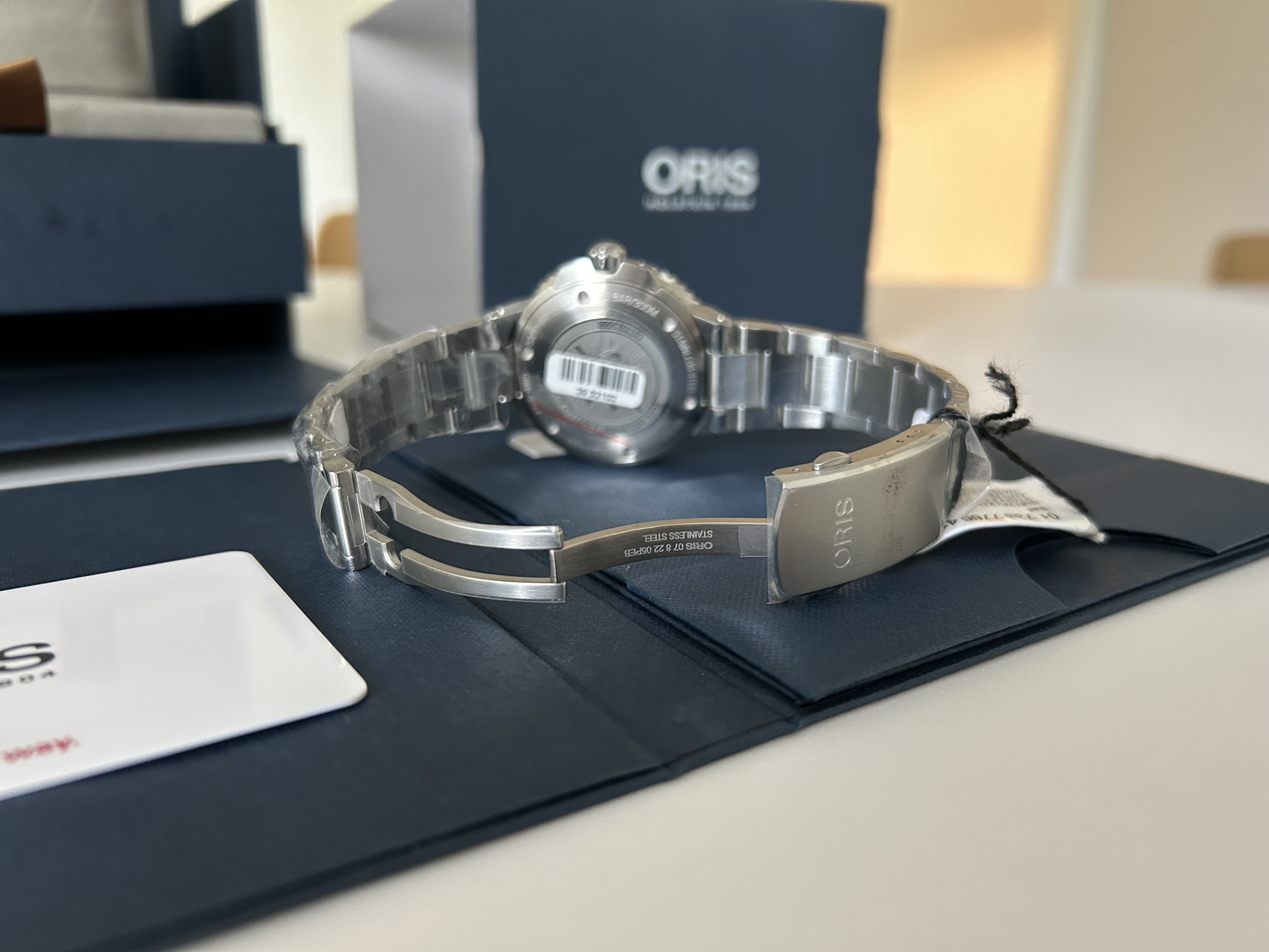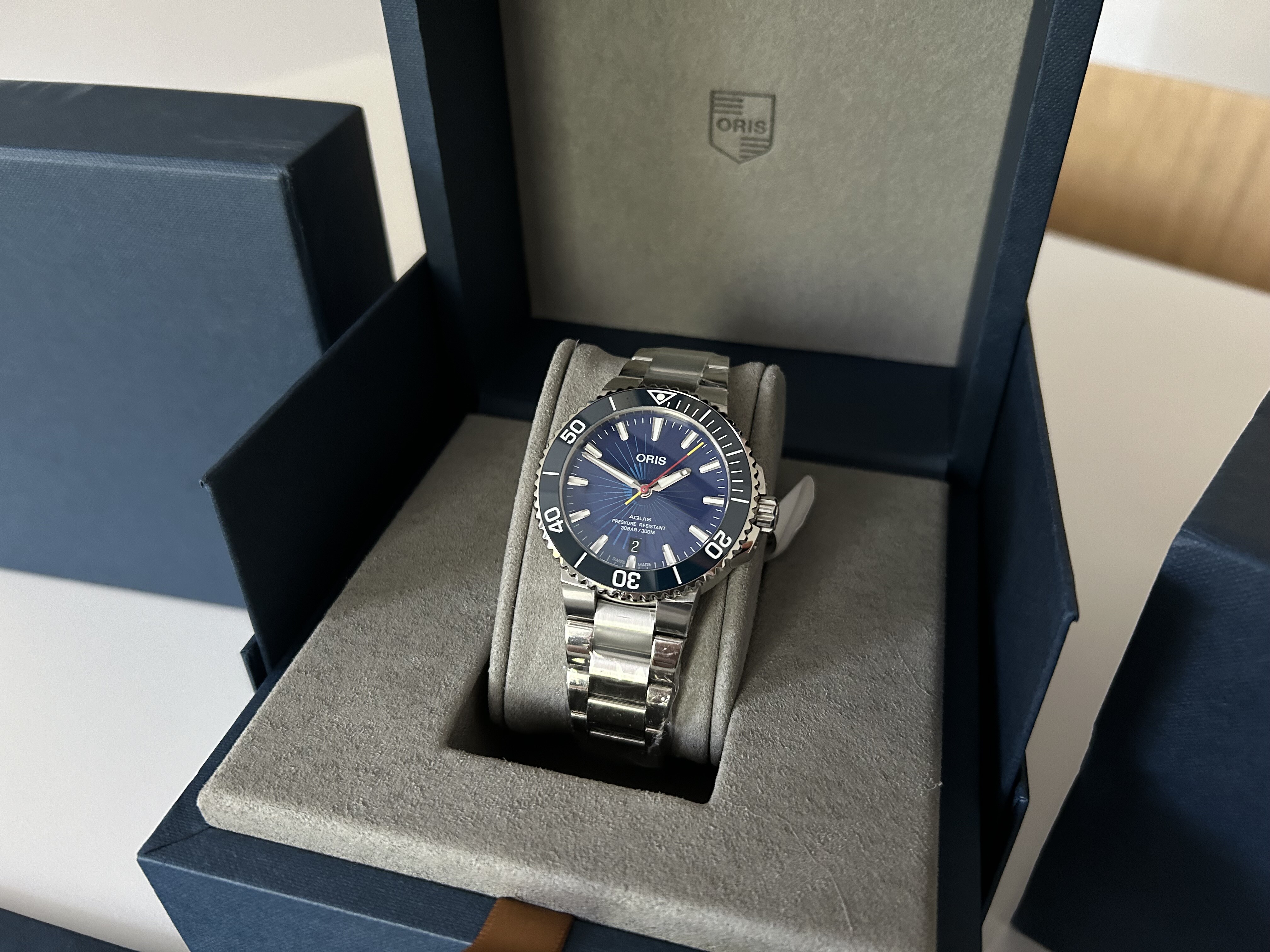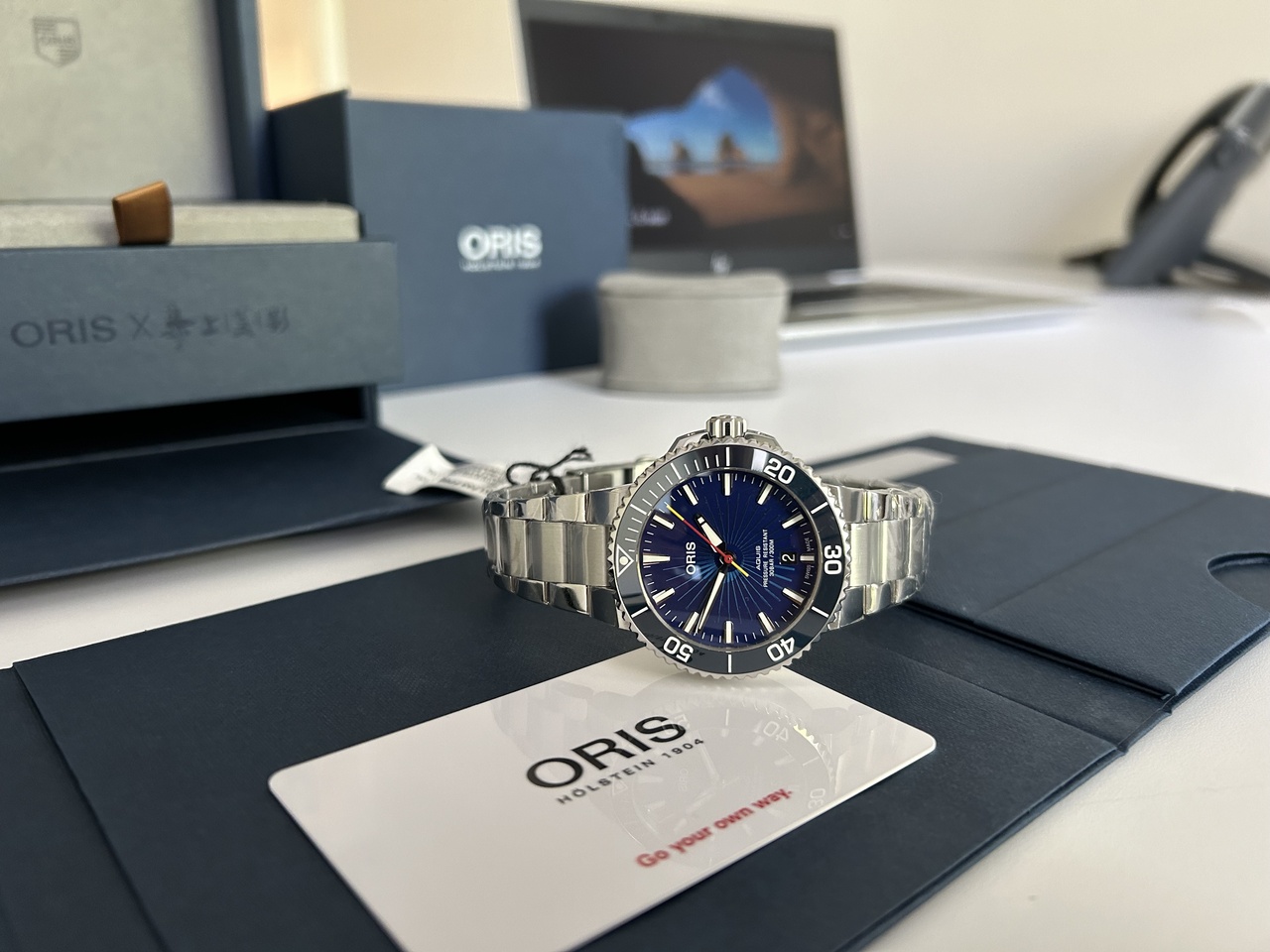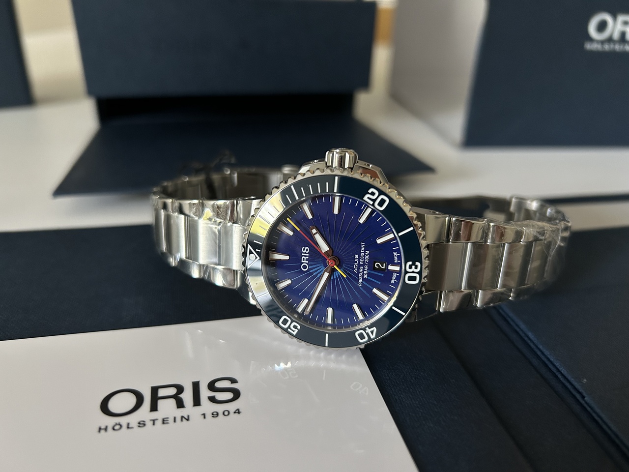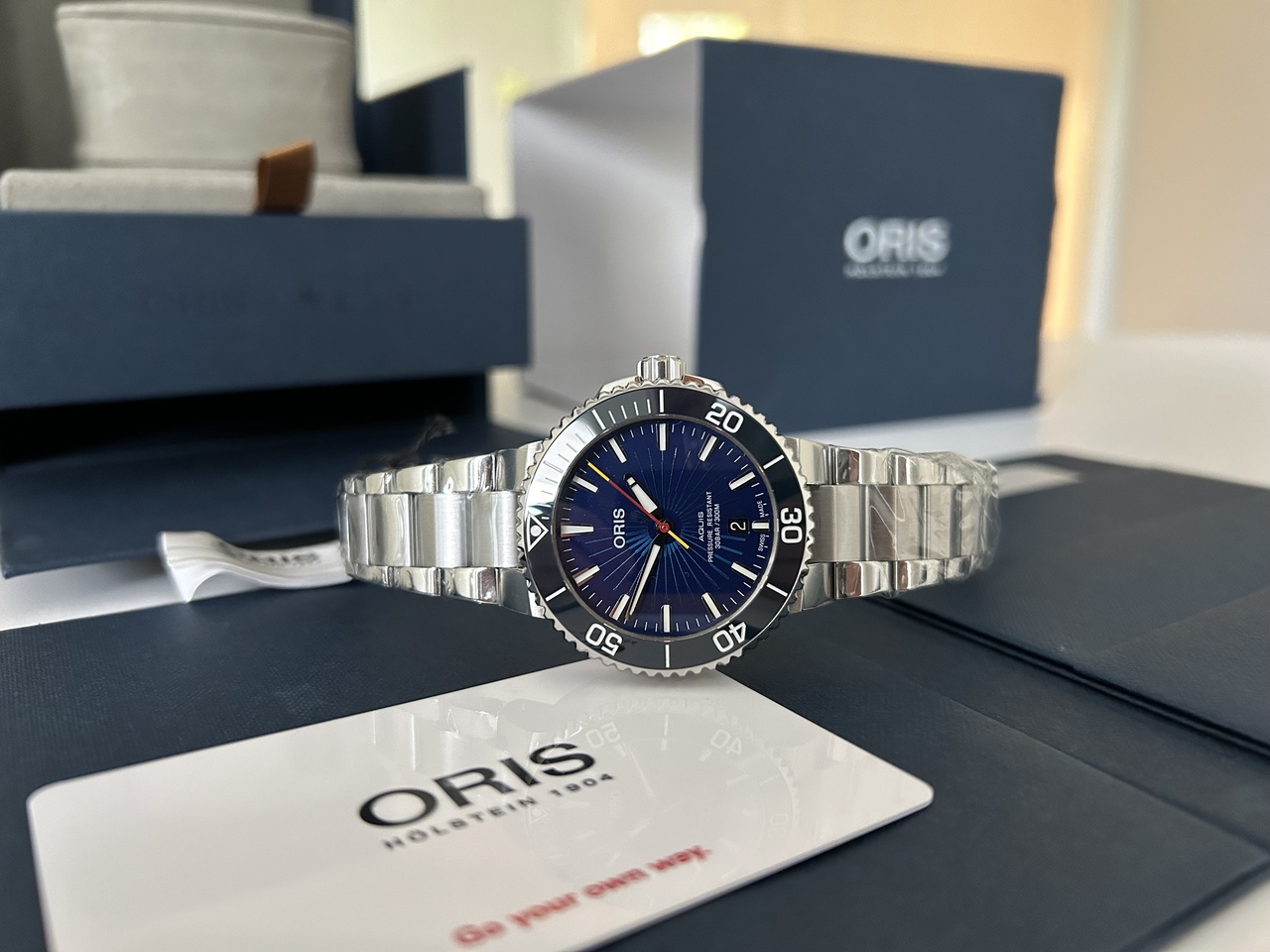 За что мы любим Oris Aquis: за размерный ряд, за классные цвета, отличную отделку, керамические безели, антиблик (который придаёт совсем другой вид часам), за отсутствие ушек у часов, отличную артикуляцию качественного браслета, сильно сужающегося к застёжке и возможность без проблем купить оригинальный ремень с удобной клипсой и всё это по самой конкурентной цене.