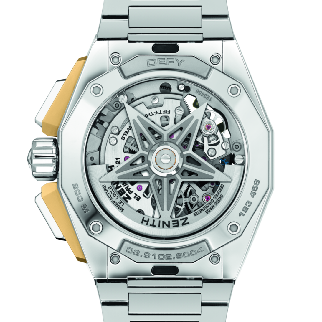 Скелетонированное исполнение циферблата открывает взору динамичную архитектуру механизма. В положении «9 часов» находится счетчик малой секундной стрелки, на отметке «3 часа» – минутный счетчик хронографа, в положении «12 часов» – индикатор запаса хода, а на отметке «6 часов» – 60-секундный счетчик хронографа. Сквозь заднюю крышку из сапфирового стекла можно увидеть знаменитый ротор в форме звезды с сатинированной отделкой – современная визитная карточка ZENITH, воплощающая исключительное мастерство Мануфактуры.