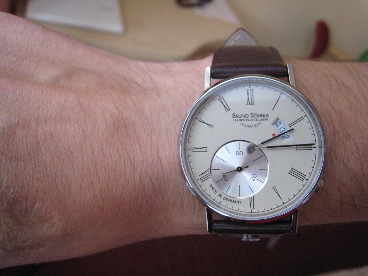 Но эти сразу бросились в глаза. Я даже не знаю точно чем они привлекли моё внимание. То ли строгостью и завершённостью своей формы, то ли циферблатом цвета слоновой кости, то ли римскими цифрами так любимыми мною, то ли часовой и минутной стрелками которые сделаны таким образом, что при мимолетном взгляде на часы кажется, буд-то бы они парят над циферблатом. А может привлекла внимание вынесенная на отдельный гильошированный серебристый циферблат секундная стрелка? Или многочисленные напоминания, видимо для тех, кто перебрал абсента после которого возможна кратковременная потеря памяти о производителе данных часов. Две первых буквы ВS названия нанесены и на заводную головку,и на ремень. Полное название выбито на застежке ремня, на задней крышке часов и с обратной стороны ремня. А может всё-таки сделанная довольно крупными буквами надпись MADE IN GERMANY? Но скорее всего совокупностью всех вышеперечисленных качеств. Лаконичность, строгость, изящество. Взяв их в руки, попытался сморщить свои извилины и хоть что-нибудь вспомнить об этом производителе, но у меня так ничего и не получилось, так как отмечалось выше , я никогда не являлся поклонником а тем более любителем немецких часов. Но, приложив их к руке понял, что именно их я и приобрету. Заикнувшись за скидку, получил от немки категоричное «найн». Спорить я не стал. Уже расплачиваясь на кассе догадался спросить что же за механизм установлен в часах. Оказалось_ обычная швейцарская кварцевая «Ронда». А я уж грешным делом подумал, что мануфактура, о чём и спросил у продавца. На что она накнопала на калькуляторе стоимость немецкой мануфактуры, от которой мои глаза увеличились до размеров стекол моих очков. Чуть позже выяснилось, что 20 евро мне все-таки скинули. Тем же вечером, вернувшись в Прагу, решил провести эксперимент о котором неоднократно упоминалось на форуме где с помощью капли воды проверяется сапфировое стекло или нет. Во избежании обвинения в манипуляциях с каплей фото данного эксперимента прилагаются. На первой фотографии капелька находится в верхней части стекла, на второй же, та-же капелька не растекаясь мыслью по древу, переместилась уже в нижнюю часть циферблата. Ну и по доброй традиции этого форума так же прилагаются фото часов на руке и без руки. А как-же Сейко и Ориент? Придет время и они все-таки появятся у меня, но это уже будет совсем другая история.