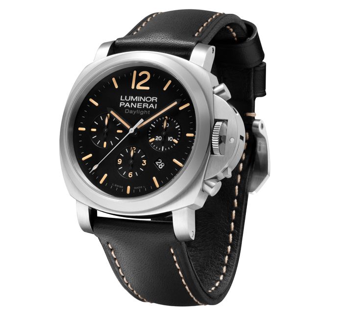 Luminor Chrono Daylight – 44 mm (PAM00356) с водонепроницаемостью до 100 метров поставляются в комплекте с черным кожаным ремешком с серо-бежевой прострочкой, сочетающейся со стилем циферблата. Большая персонализированная пряжка с логотипом Panerai, также как и корпус, выполнена из стали AISI 316L, имеет полированное покрытие. В комплекте имеется запасной резиновый ремешок и специальный инструмент для его замены.