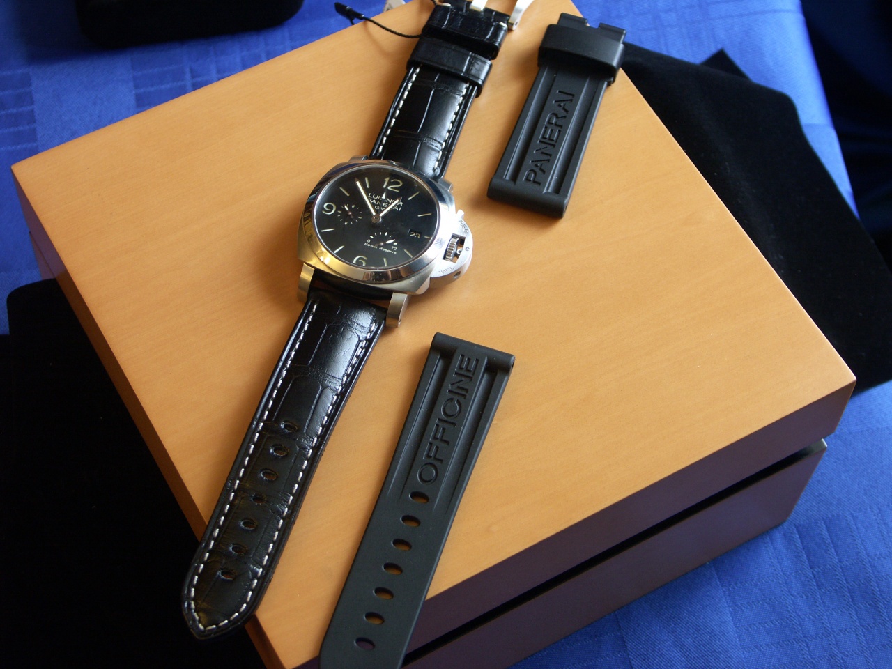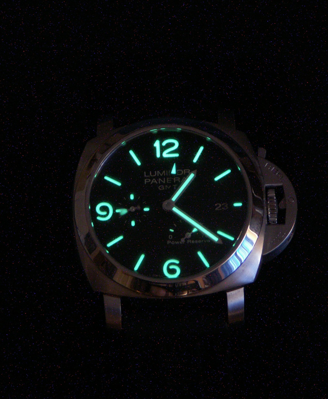 Собственно, о часах. Оказались действительно массивные, как надо, и не такие уж маленькие. GMT и резерв – на своих местах, имхо, ничего лишнего. Стеклышко сзади, стеклышко спереди. Там крутится, тут болтается. Все как надо. В общем, теперь и у меня есть Панерай.