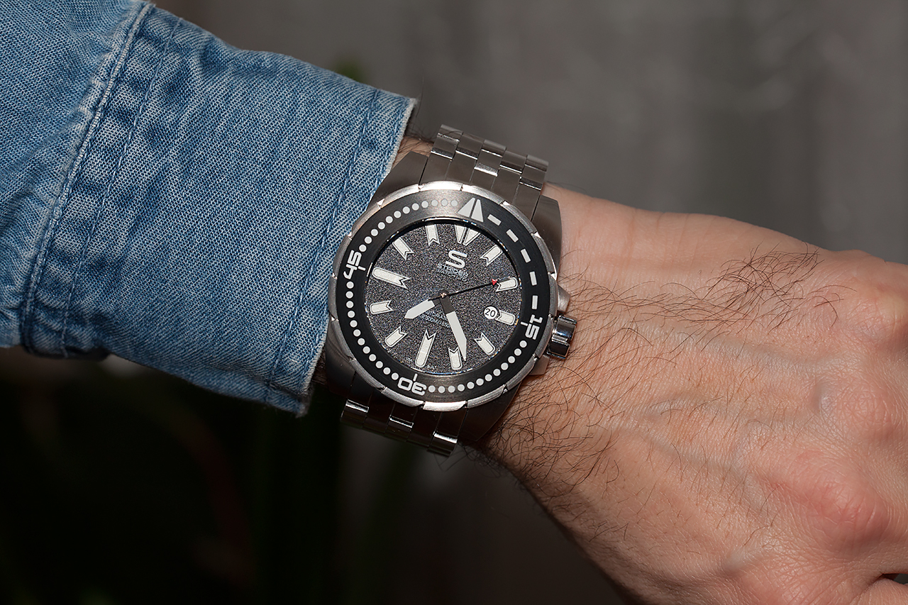 Безель имеет зубцы-пилы, бросается в глаза на руке и это очень хорошо, что бросается- смотрится стильно.