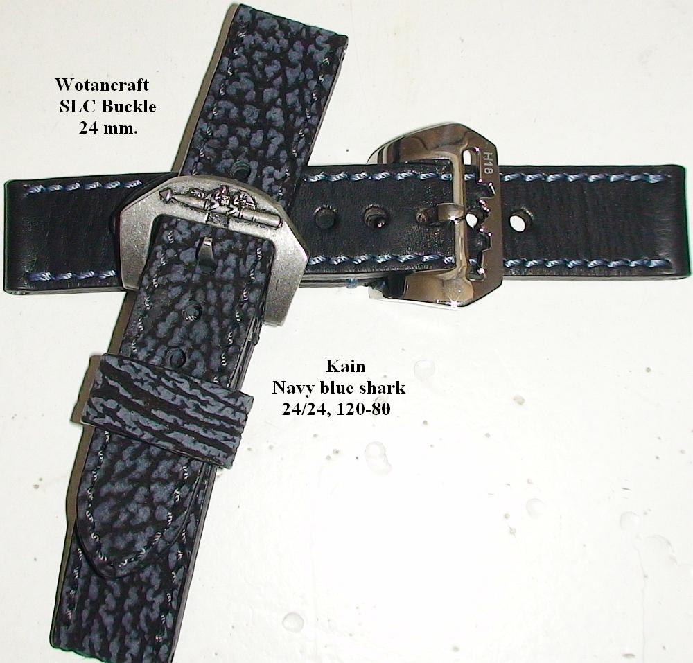- И мой любимый Kain Navy blue shark 24/24-120-80, 4,2 мм. тол. с баклей от Wotancraft SLC 24 mm. Ремень мягкий, поверхность на ощупь бархатистая, бакля с орнаментом пловцов на управляемой торпеде органически сливается воедино с кожей акулы. Ремень подходит как для повседневного ношения ,так и для прогулок на море ))). Люди которые понимают толк в хороших часах не раз обращали внимание на этот ремень ))).