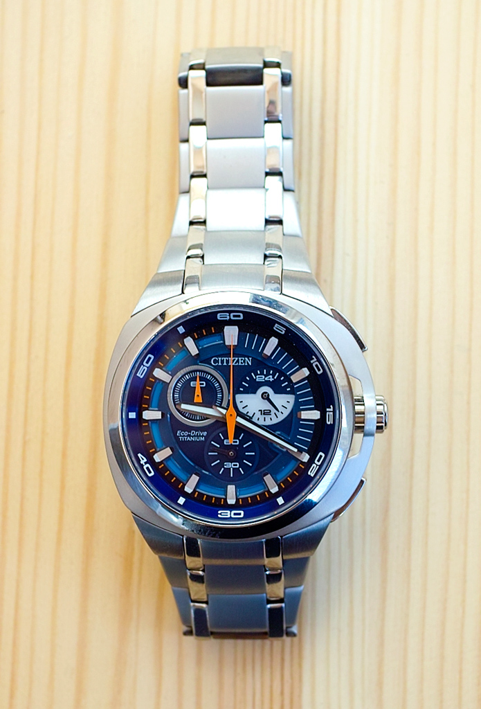 Что же я получил? Эко-драйв, титан, сапфир, 100м, достаточно яркий люминофор, очень хорошее качество сборки и отделки, понравившийся дизайн и потрясающий цвет! Часами очень доволен, но об их эксплуатационных качествах пака говорить рано. Из замеченных недостатков отмечу неточно встающую на деления центральную секундную стрелку хронографа.
