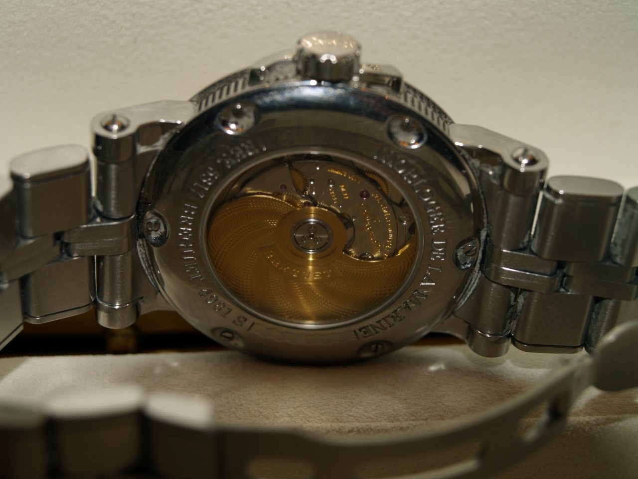 Сапфировая задняя крышка, крупное двойное окошко даты, завинчивающаяся заводная головка.