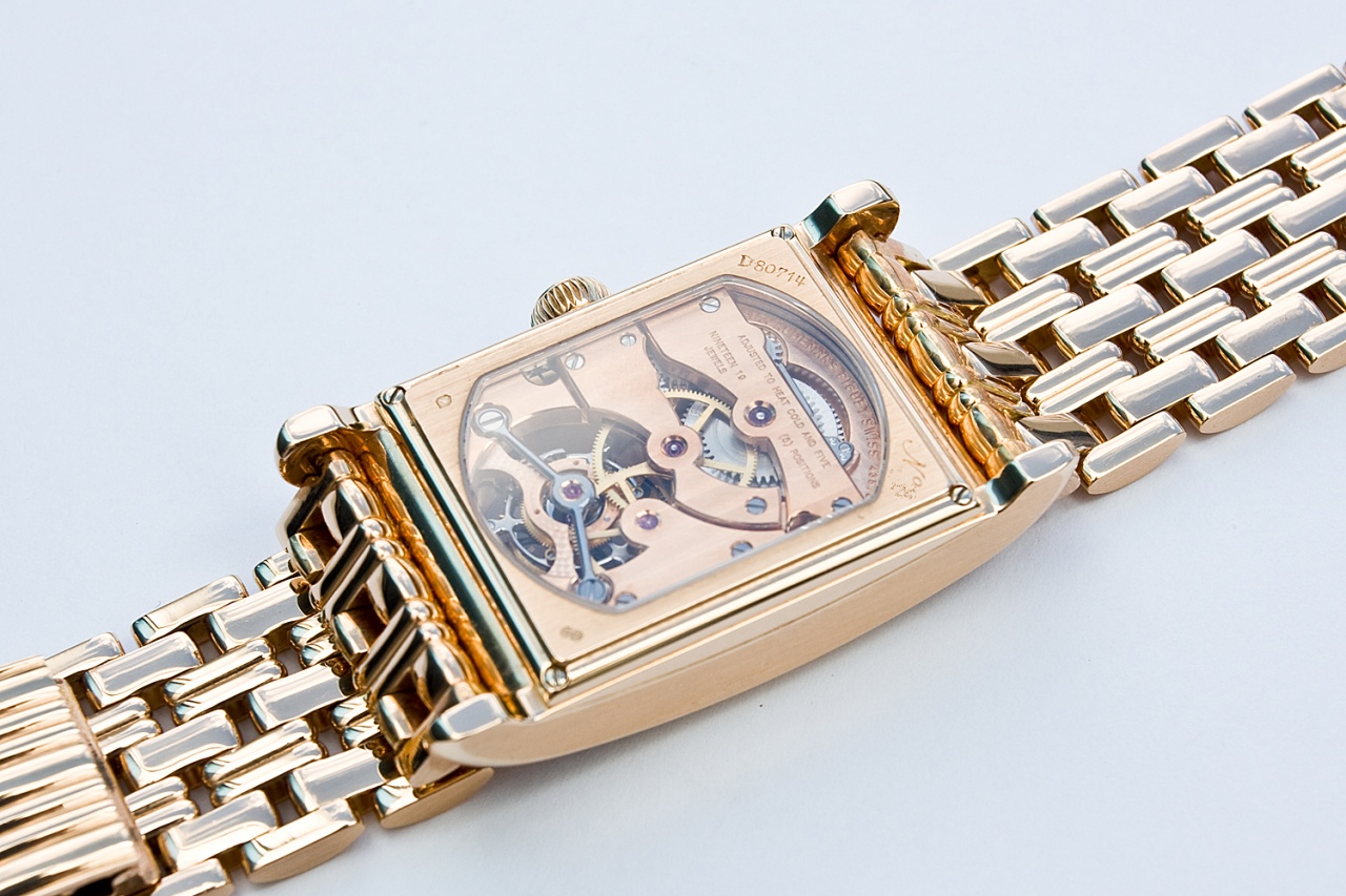 Корпус размером 47х27 мм выполнен из розового золота 18 Карат.