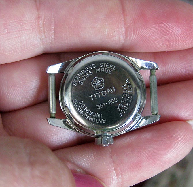 На амер. барахолке нашла такие часы за 5 долл. Страшные были, грязные и поцарапанные, но пошли как завела. Понравилось что с цветочком и число красное с увеличительным стеклом, хорошо видно. На заводной головке тоже цветочек. Принесла домой, отмыла, отполировала стекло и корпус, получились почти как новые и идут хорошо. На цифере написано Titoni Airmaster, 25 jewels, Rotomatic, Swiss made. Какого года могут быть примерно эти часы? И что такое Rotomatic, Incabloc и Titoflex? Пробовала искать по номеру модели - там только на китайском что-то в Гугле вылезает. Я заднюю крышку открыла, часы судя по всему автоматические, с ротором. Маленькие очень - всего 20 мм корпус (женские), но такие приятненькие, тяжеленькие...