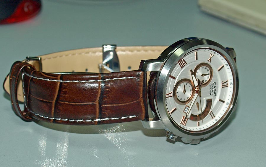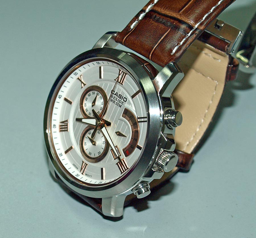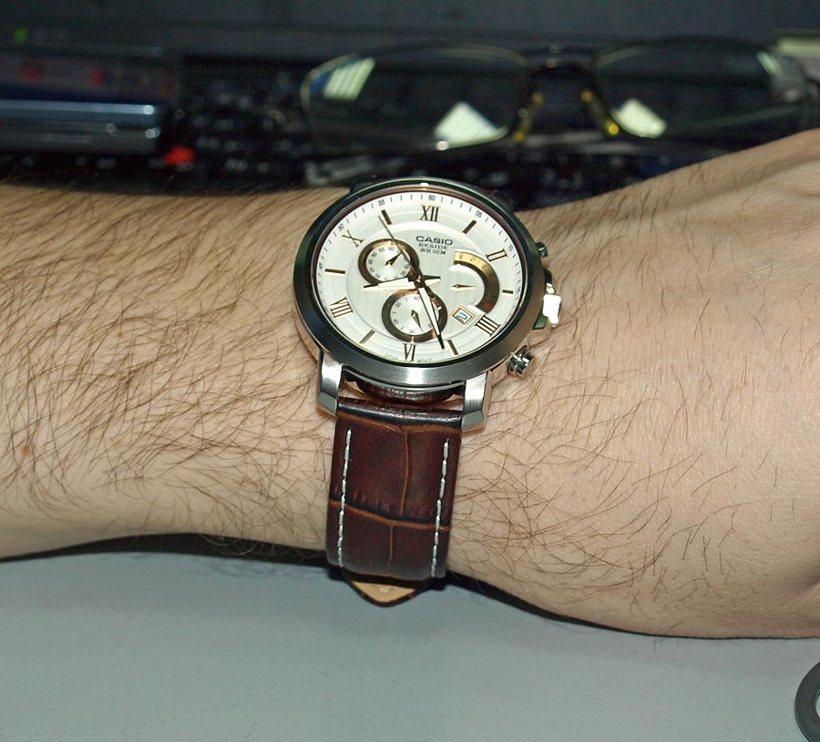Вместе выбирали - хотел более менее строгое, с белым циферблатом, окошком даты и ремешком.