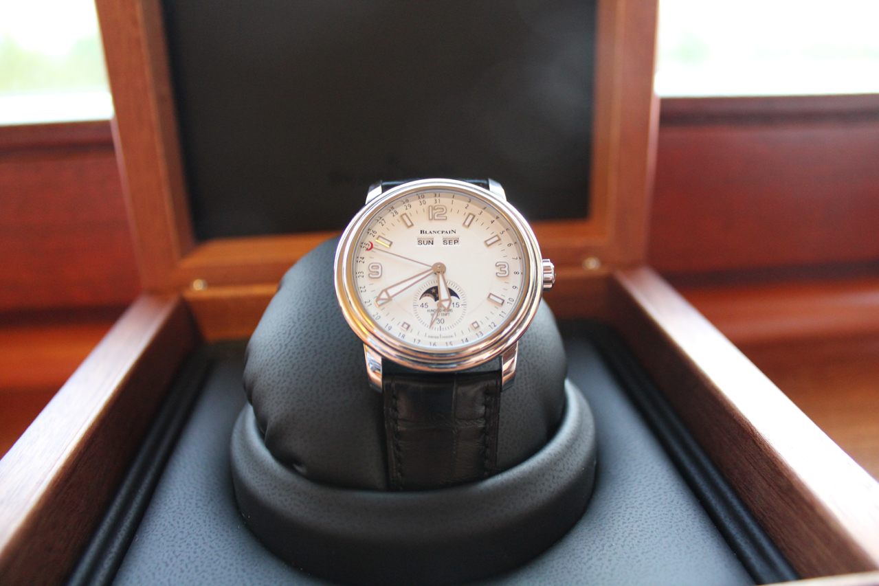 Часы вживую очень интересные, отличные характеристики механизма, полезные усложнения (ну, а лунник просто для души), узнаваемые стрелки Бланпа. Как мне сказали их только что сняли с выпуска, так что берите, если нравится, потом найти будет трудно.