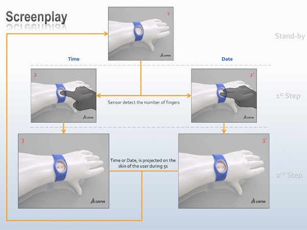 Никаких стрелок и цифр – к чему эти рудименты часам будущего? Хотя, нет: цифры у Elusive всё же есть. Просто они появляются прямо на вашей руке, и только после того, как вы же нажмёте несуществующую кнопку (её функцию выполняют сенсоры внутри кольца), на «циферблате». При нажатии одним пальцем, встроенный лазер отобразит на коже время, а жест двумя пальцами заставит девайс показать дату. Выполнив своё прямое назначение, часики автоматически перейдут в «ждущий режим» - чтобы заряд батареек экономить.