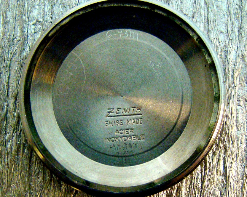 CASE: SCREW BACK OUTSIDE SIGNED WATERPROOF INSIDE THE BACK IS SIGNED ZENITH SWISS MADE ACIER INOXYDABLE