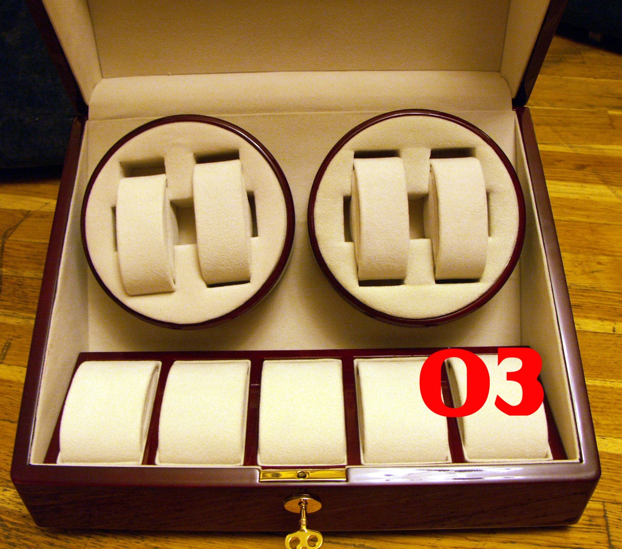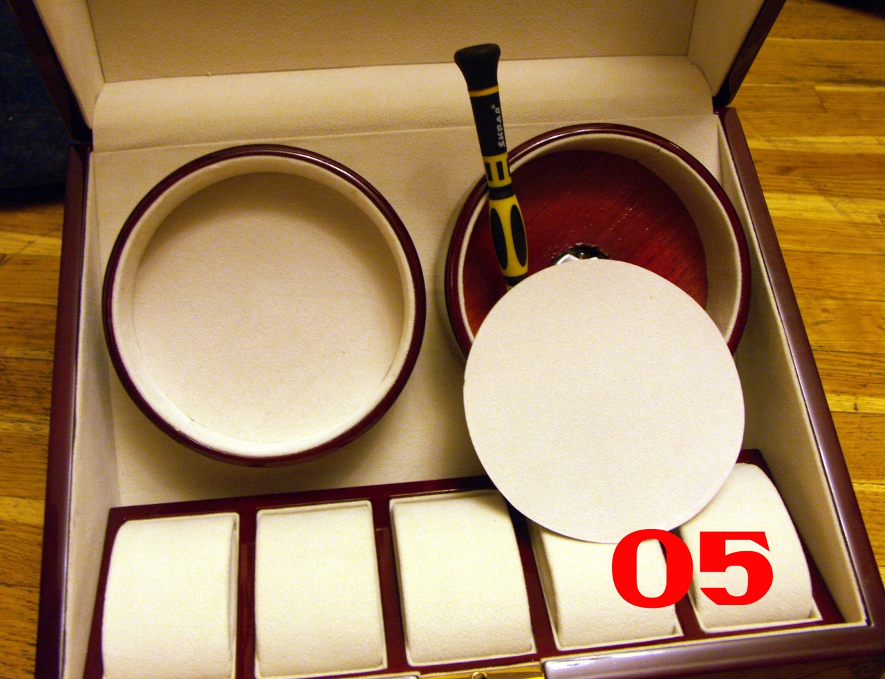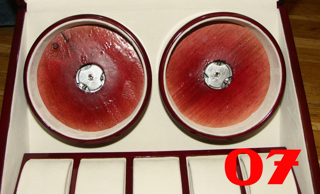 Внешний осмотр показал достаточно приемлемое качество покрытия, нормальный внешний вид и достаточную прозрачность стекла. Стекло, ясен пень, за такие деньги было пластиковое и прямое, как политика партии, а не гнутое, как на виндере MODALO. С одной стороны – и фиг бы с ним, а с другой – меньше места для вращающихся часов. Ибо, как показал опыт, если 47-мм зверюгу поместить на крутящуюся титьку заводной головкой наружу, при плохом раскладе звезд на небе головка будет чиркать по внутренней обивке закрытой крышки. Если это обнаружить спустя продолжительное время, на обивке будет уже вполне различимая канавка, как от шин на асфальте. То есть, запоминаем: головкой внутрь. Лак – красное дерево, без изъянов.