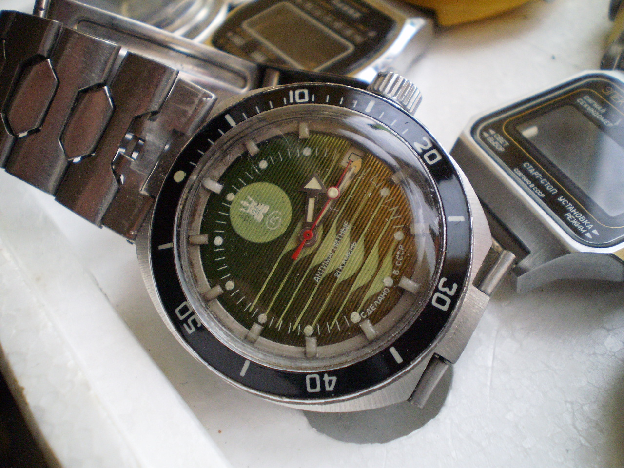 Советский Нептун . вот стал обладателем такой красоты . только надо браслет родной поставить (зимовский я думаю ) . думал Нептун только российский был . буду ещё зелёный базель искать . а внутри 2416 б . циферблат очень красиво переливается