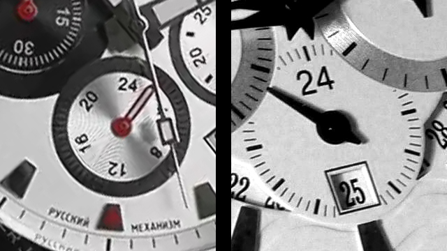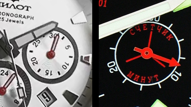 Разметку циферблата счётчика минут вела бригада идиотов, однозначно: 0; 2,5; 5; 7,5; 10… То, что стрелка минутного накопителя не попадёт на половину делений их разметки, парнишек не беспокоило. Такую же разметку использует г. Володько в «Гагаринском» хронографе. «А чо, — говорит производитель, — пипл хавает. Для сельской местности потянет. Не ндравицца, не покупай… Ишь, ты, какой вумный, выучили вас на нашу голову»…