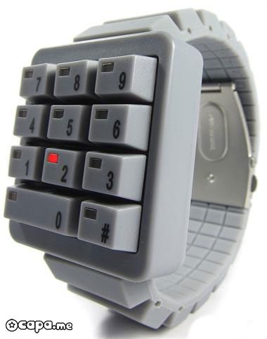 Click Keypad LED от компании Watchismo – часы не для всех. Они для тех, кто не боится быть особенным и, конечно, стильным. Внешне модель выглядит как наручная цифровая клавиатура с дополнительной клавишей «решетка». Чтобы узнать время, нужно нажать любую кнопку от 0 до 9 и пронаблюдать, как на 4-х клавишах поочередно мигнет подсветка. Скажем, это будут цифры 0, 9, 1, 5 – значит, время сейчас 9:15. Дата определяется аналогичным образом, например, сочетание цифр 0, 7, 2, 4 означает «24 июля» и т.д. Стоит Click Keypad LED ни много ни мало 90 долларов. Покупатель может выбрать из нескольких цветовых вариантов.