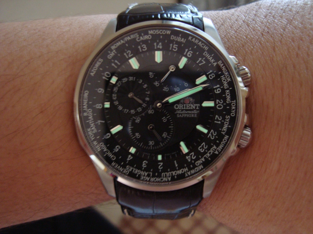 о самих часах. В часах стоит механизм 46H (EY); 23 камня; автоподзавод (ручного подзавода и стоп-секунды нет); плоское сапфировое стекло (какое стекло на задней крышке не знаю); водозащита 100 метров; точность хода, заявленная производителем +25/-15 сек/сутки. Функции - отображение часов, минут, секунд, дата, индикатор запаса хода, мировое время GMT в 24 часовых поясах (по городам). Кожаный глянцевый ремешок чёрного цвета, стилизованный под кожу крокодила. Застёжка "бабочка", что очень удобно.