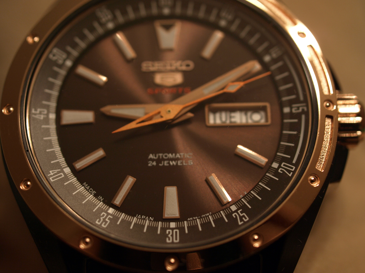 - калибр Seiko 4R36, 24 драгоценных камня, функция остановки стрелок