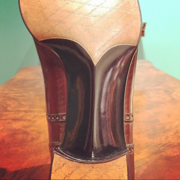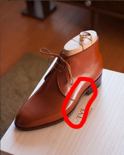 Обведенным выделена разница этих двух вариантов, но когда обувь на ноге - разница более видна. Рант со скрипичной талией не виден в том месте где она проходит. Раскатывают кожу на подошве обычной деревянной круглой палкой, "лишние" края после раскатки подрезают вот до такого состояния (пример Eiji Murata ):