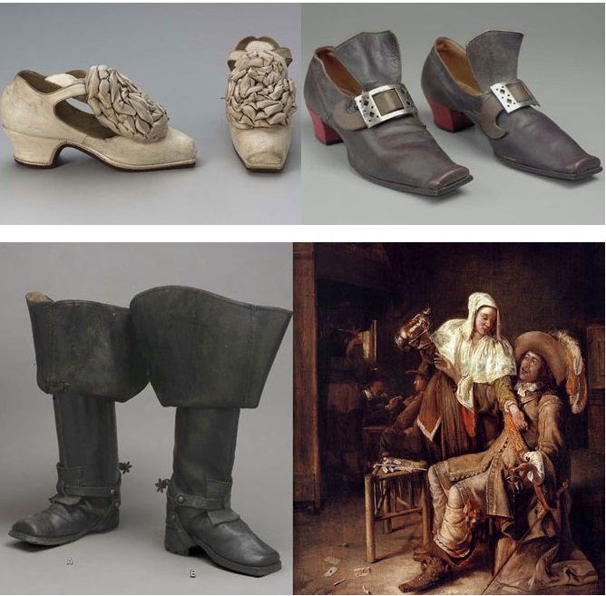 Питер Брейгель-старший (1568) носил, согласно моде своего времени, широкую обувь («коровья морда») и белые чулки.