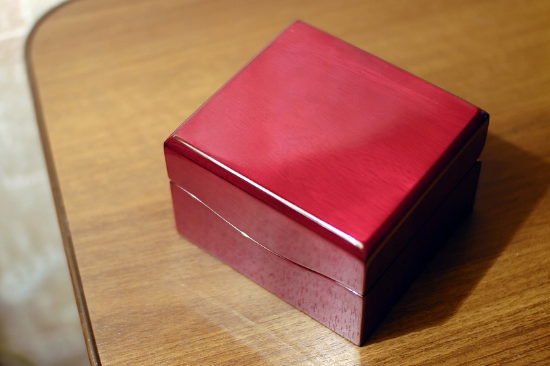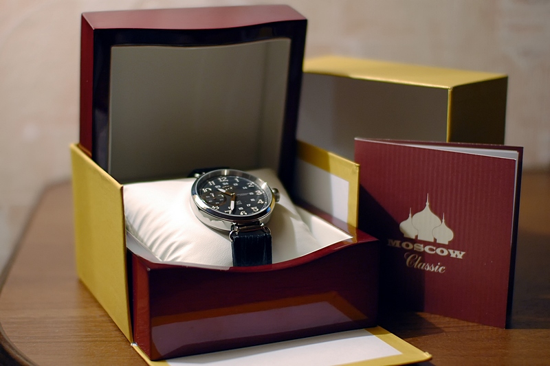 Через неделю внутри посылки я обнаружил картонную коробку с золотистым отливом, в которой находился лакированный деревянный футляр малинового цвета. В нём-то на белой подушке и возлежал "Штурмовик". Как мне показалось, один этот футляр для часов тянет по стоимости на добрую тысячу рублей. К слову сказать, увидел в его наличии жирный плюс - когда часы находятся в таком деревянной сейфе да на мягкой подушке, во время транспортировки к получателю им ровным счётом ничего не угрожает.