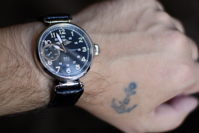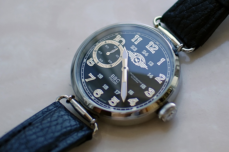Водолаз" и выглядит не так брутально. В нём присутствует некоторая воздушность и, я бы даже сказал, вычурность некоего ювелирного изделия. Такое впечатление от внешнему вида "Штурмовика" порождает, на мой взгляд, обилие различных элементов на циферблате. Это и широкое блестящее кольцо, в которое заключена секундная стрелка, и такие же поблескивающие полированными краями рельефные цифры основной часовой шкалы, и белая рябь более мелких циферок дополнительной 24-х часовой, и эмблема в виде крылышек, летящего самолёта и вывески "Штурмовик" в верхней части цифера. И, если надпись "ВВС РОССИИ", выполненная чем-то типа серебрянки и расположенная в нижней части циферблата, как, впрочем, и два слова мелким шрифтом "ПРОТИВОУДАРНЫЕ" и "18 КАМНЕЙ", имеющиеся на правой его стороне, в глаза совершенно не бросаются, то вот другие элементы своим видом (а некоторые и присутствием) придают часам облик несколько аляповатый.