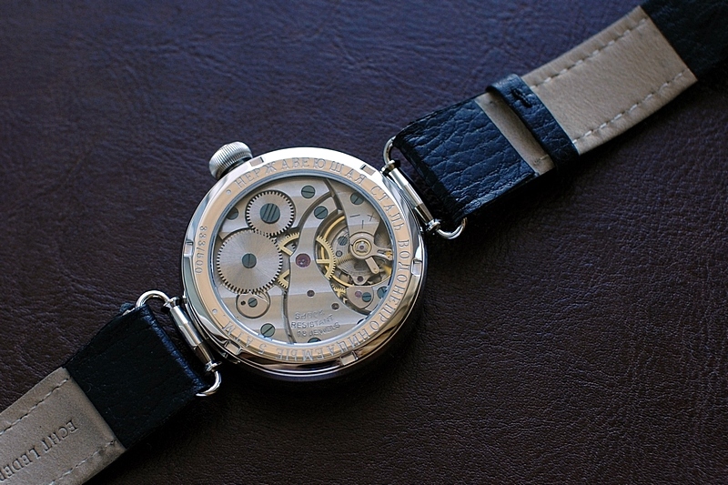 На стальной и завинчивающейся крышке корпуса часов по окружности имеется гравировка: "НЕРЖАВЕЮЩАЯ СТАЛЬ ВОДОНЕПРОНИЦАЕМЫЕ 5 АТМ"; там же прописано: "№ 333/500" (надо полагать - 333-й экзепляр из партии в 500 шт.).