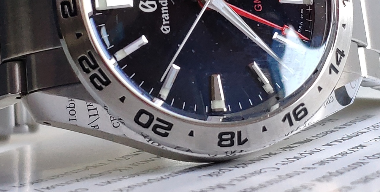 А у Гранд Сейко этот элемент состоит из двух деталей. Тоже крашеное (мне кажется покраска более качественная) кольцо с метками и двумя цветами для дня и ночи в 24 часовой шкале. А над ним стальное кольцо полированное в зеркало! Это, конечно, не надпись: "Rolex. Rolex...", но тоже приятно. Полировка классная. На фото можно видеть кончик GMT стрелки в отражении.