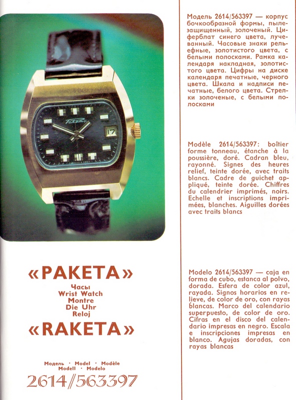 Более 50 сшитых листов в мягкой обложке. Есть некоторые ошибки в описаниях и бросается в глаза разносортица заводных головок у некоторых корпусов. Интересно, что Ракета "амфибия" в описании имеет "брызгозащищенный" корпус. Очень широко представлены часы в корпусах "бейкер". Крупные фото образцов механизмов.