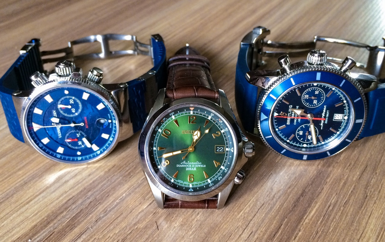 "Приборная панель") Слева направо: Seiko Sarb017 Alpinist, Ulysse Nardin Blue Seal LE, Breitling Superocean Heritage 44.