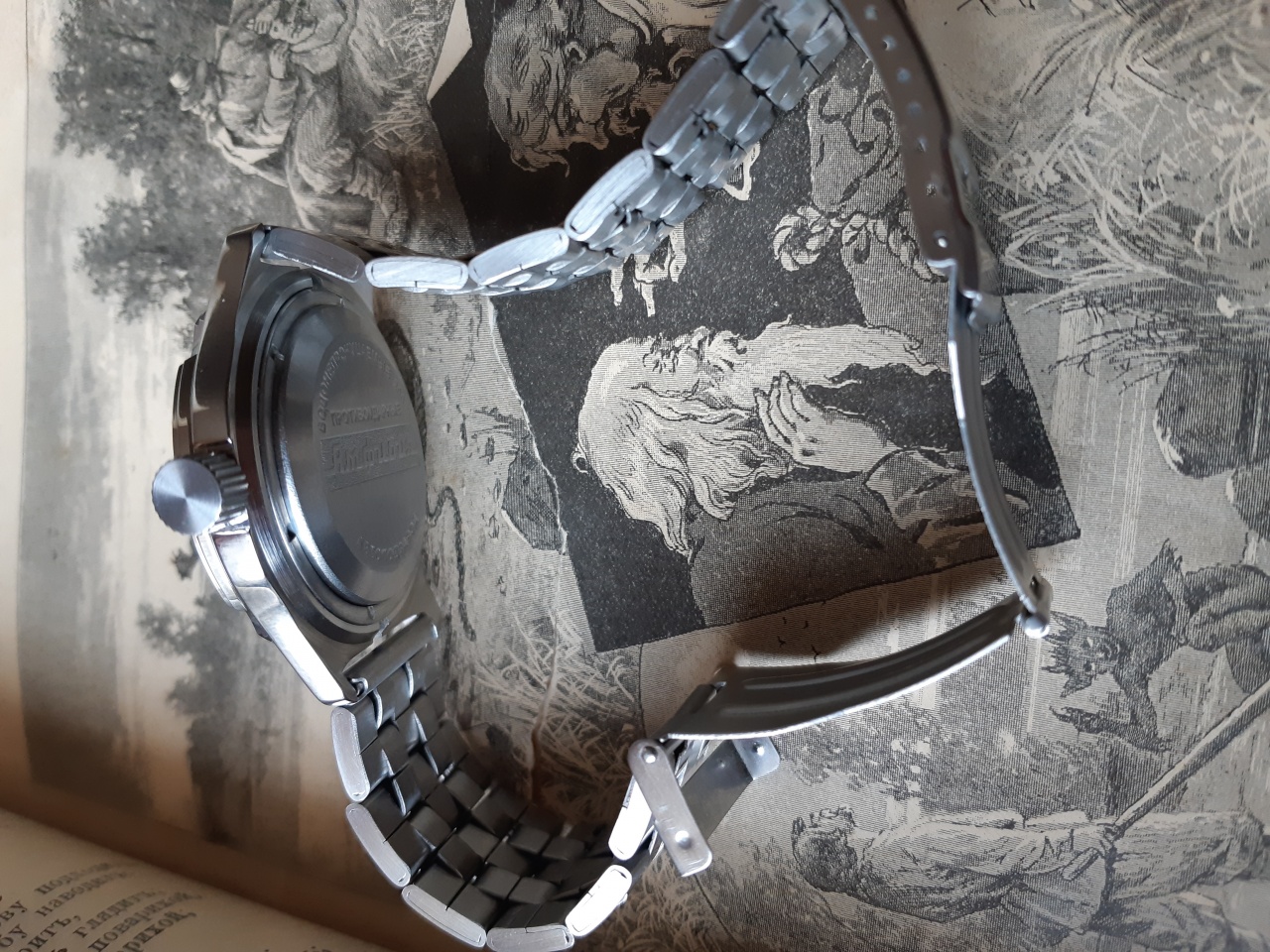 На 160355 поставил комкомовскую резинку и безель, оставшийся от мераномовского СЕ 150 с оранжево-черным цифером. Вроде бы, вышло довольно органично, разве может секундную на белую поменять? Но внутрь я пока не лезу - нечем, да и опасаюсь из-за кривизны рук.
