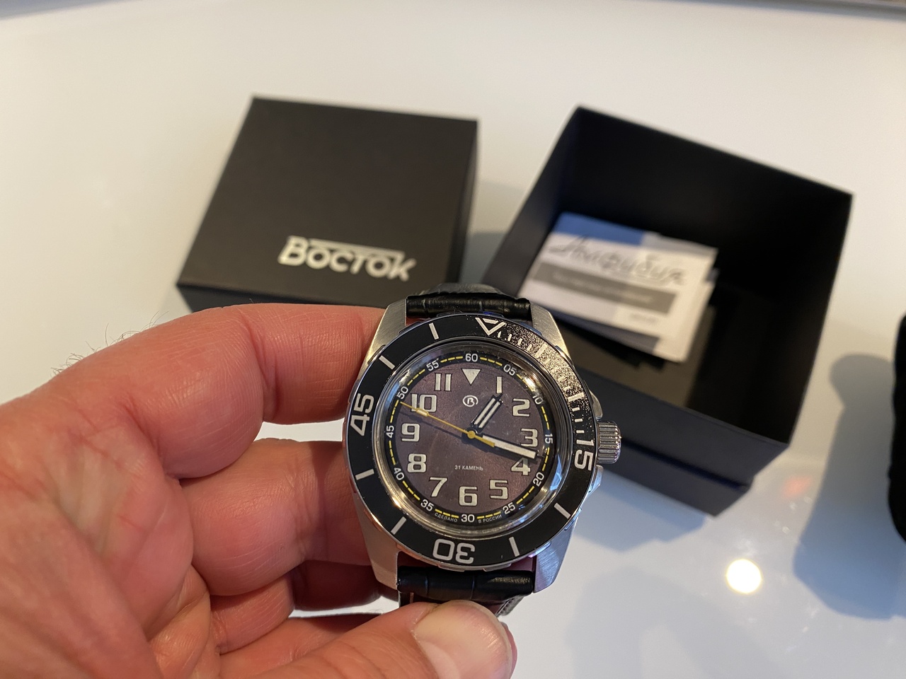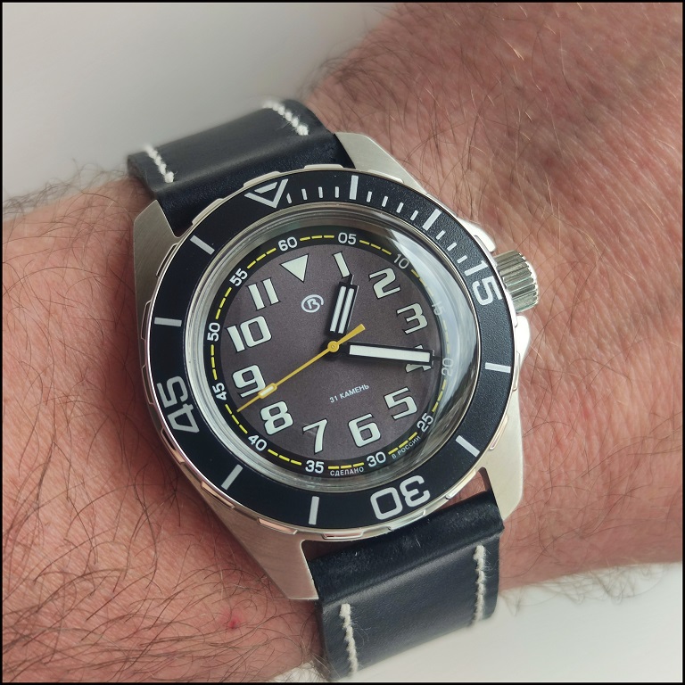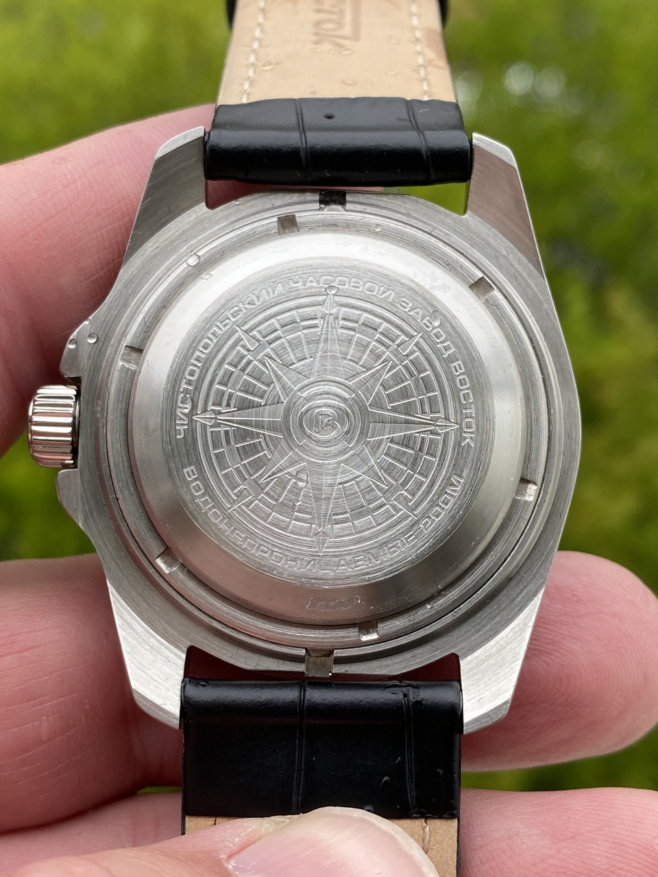 Но жаба душит платить за переходник на ремешок 1150 руб с доставкой (зачем вообще такой корпус придумали?). Поэтому была куплена бочка Амфибия 2415.01/090661 за 5000 руб. Давно мечтал о такой форм-факторе, а тут еще и цвет совпал.