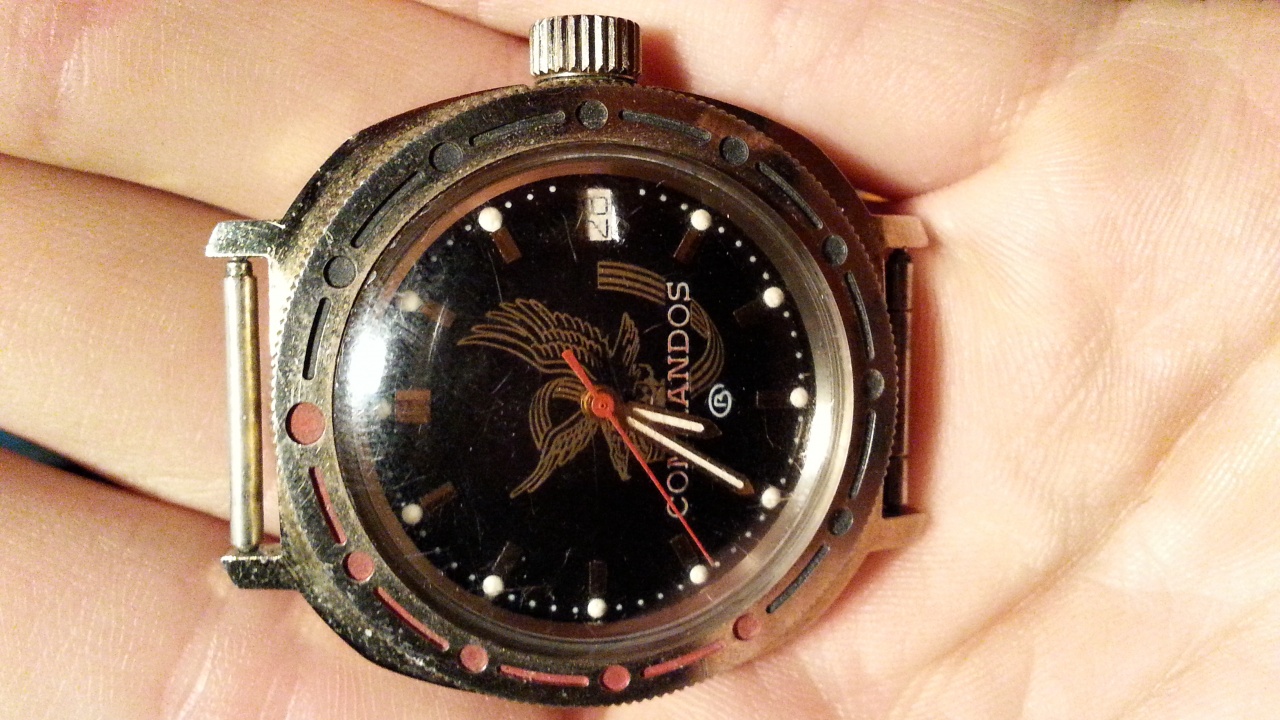 Snevar. Часы начала 90-ых. Механизм естественно 2414А. Какой Командос? Помните фильмец 1985 года "Командо" с Арни в главной роли? Так вот это к нему и приурочено! Запас хода часов такой же как и запас боеприпасов Калаша, которым Арни косил врагов на острове.
