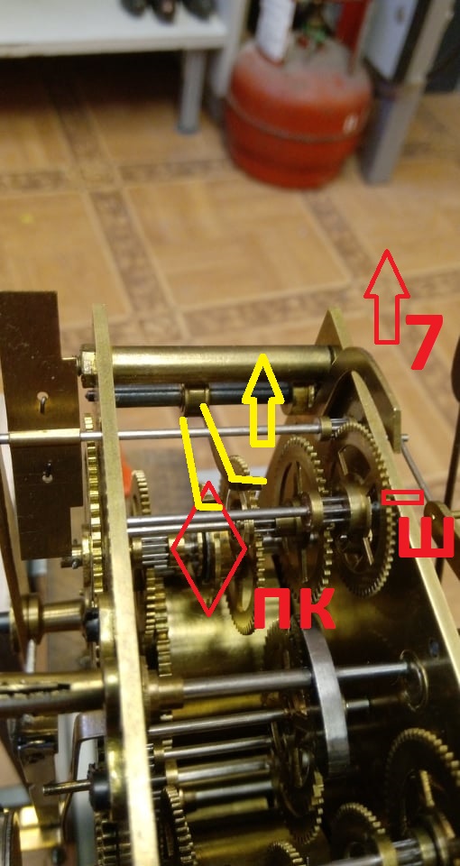 (!) нижнее плечо – ограничитель четвертей(желтый) должен располагаться в паузе между 3 и 4 четвертью программного колеса