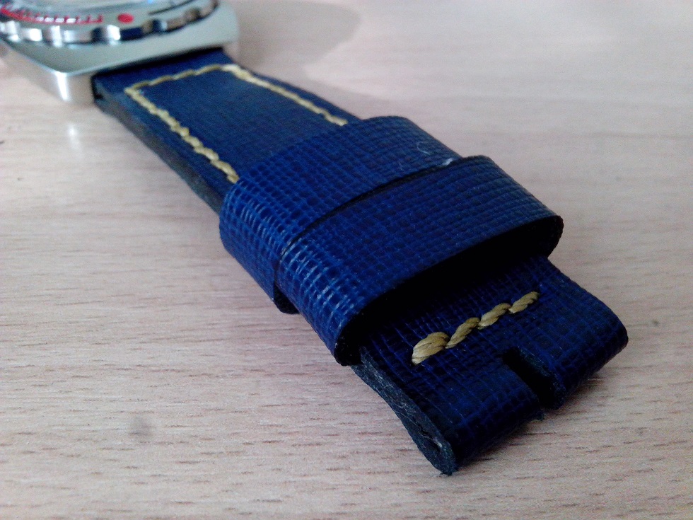 Благодарю уважаемого коллегу по Форуму Kapter007, от которого я получил на днях шикарный ремешок из кожи сафьяно. Ремешок ручной работы, очень мягкий, толстый и синий - идеален для моей Амфибии "Бочка" с синим цифером. Как пишут, в "сафьяно" покрытие кожи из полиуретана защищает ее от повреждений, и это то, что мне надо, ведь Амфибия у меня как раз для разного рода экстрима. Стежки ровные и вообще он весь отдает качеством.