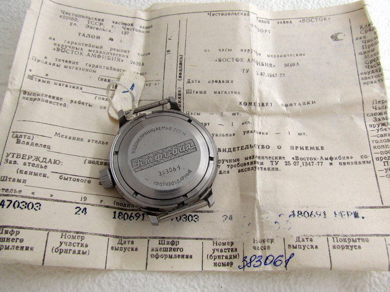 1. Как известно, существуют часы "Desert Shield" с надписью "Made in USSR" и логотипом "В" на циферблате: это говорит о том, что "Афибии" с данным оформлением стали доступны для внутреннего рынка ещё при СССР или немногим после его распада, хотя в каталоге "Востока" за 1993 г. часов с таким оформлением я не обнаружил. Также существуют внутрироссийские "Амфибии - DS" с надписью "Made in USSR", но без логотипа "В": по-видимому, это наиболее ранний вариант этих часов для внутреннего рынка. Так как такой циферблат - часть часов, произведённых по эксклюзивному заказу "Timepiece Russian Watches Inc.", предположу, что у "Амфибий" с этим циферблатом не было каталожного номера, поэтому они могли укомплектовываться документами от часов с другим оформлением - это вполне возможно, учитывая "бардак" начала 1990-х гг (обратите внимание на незаполненный документ к часам). А устанавливаться во внутрироссийские часы эти циферблаты начали, по-видимому, из-за того, что после выполнения экспортного заказа на заводе осталось некоторое количество неиспользованных аутентичных циферблатов - немногим позднее на цифер "DS" добавили логотип "В" и у данного оформления появился каталожный номер. Предположительно так и зародилась традиция выпуска чалов "DS", которая продолжается и по сей день. Повторюсь, всё это ИМХО.