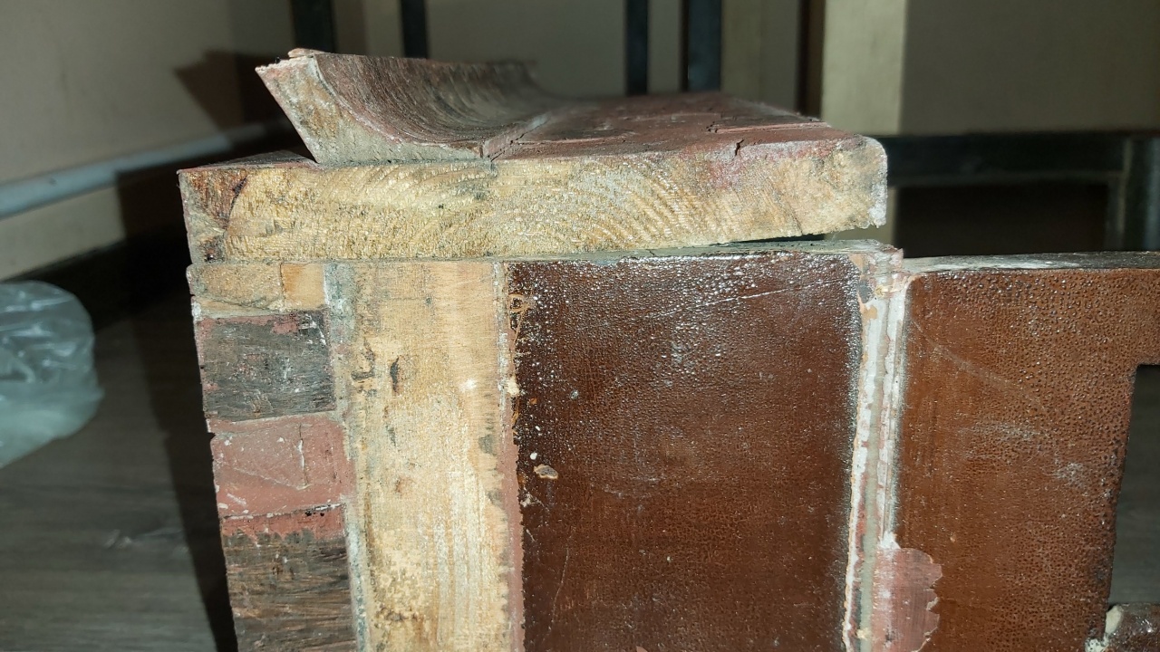 Одно соединение лсточкин хвост разошлось (давно и держалось на килограмме шпаклевки), и я грешным делом подумал, что легче будет весь корпус разобрать. Второе соединение пока рассоединял - пожалел, что этим занялся, оно очень крепко сидело, другую сторону не стал трогать. Еще подумал бороду отсоединить, но это тоже было ошибкой, зря только декоративную планочку оторвал :-(, но хоть аккуратно, приклею потом. Пока параллельно ремонтирую элементы декора, который снял: где что то расслоилось или отошло, а таких мест оказалось много, все это проклеиваю со струбцинками, чищу. Вытащил уже штук 20 гвоздей ненужных разного калибра (хотя все детали были приклеены, вероятно кроме штапиков на стела), рад, что отвалившиеся детали приколачивали хоть и на скорую руку, хоть не выкидывали, единственно как я понял - кокошника не хватает...