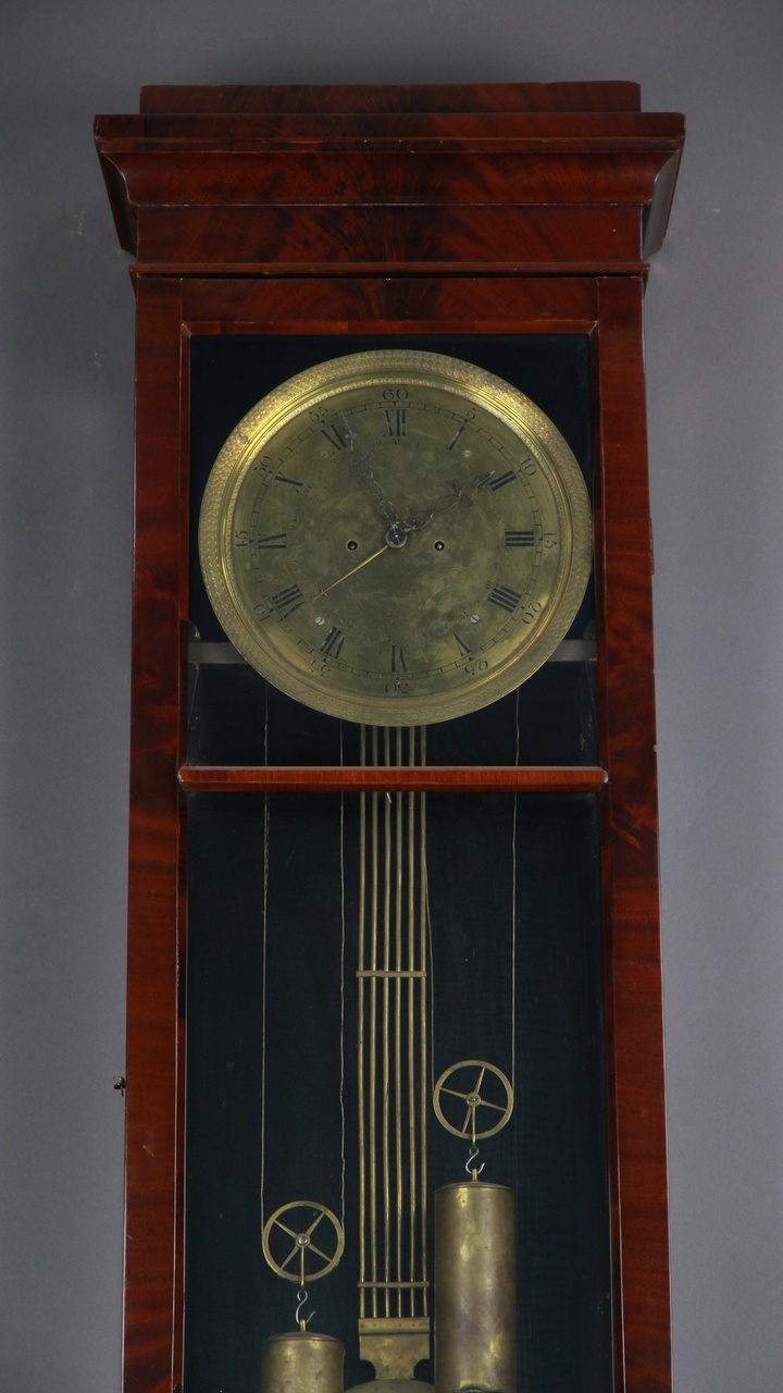 часы! Их корпус выполнен из орехового дерева, на циферблат нанесена разметка с раздельным отображением часов, минут и секунд, соответствующая астрономическим часам, а механизм имеет жильный гиревой привод.